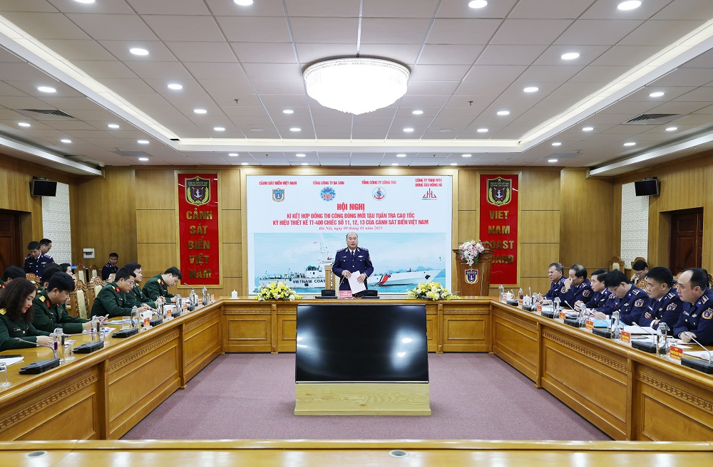 Trung tướng Lê Quang Đạo - Tư lệnh Cảnh sát biển Việt Nam phát biểu tại Hội nghị ký kết hợp đồng thi công đóng mới tàu tuần tra cao tốc ký hiệu thiết kế TT-400 chiếc số 11, 12, 13.