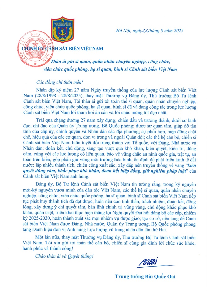 Nhân dịp kỷ niệm 27 năm Ngày Truyền thống của Lực lượng Cảnh sát biển Việt Nam (28/8/1998 - 28/8/2025), để kịp thời động viên cán bộ, chiến sĩ trong toàn Lực lượng phát huy thành tích đã đạt được trong 27 năm qua; chủ động, sáng tạo, khắc phục khó khăn, quyết tâm hoàn thành tốt nhiệm vụ được giao, tiếp tục lập nhiều chiến công, tô thắm thêm truyền thống "kiên quyết dũng cảm, khắc phục khó khăn, đoàn kết hiệp đồng, giữ nghiêm pháp luật" của Cảnh sát biển Việt Nam anh hùng, Chính ủy Cảnh sát biển Việt Nam có Thư gửi cán bộ, chiến sĩ toàn Lực lượng.