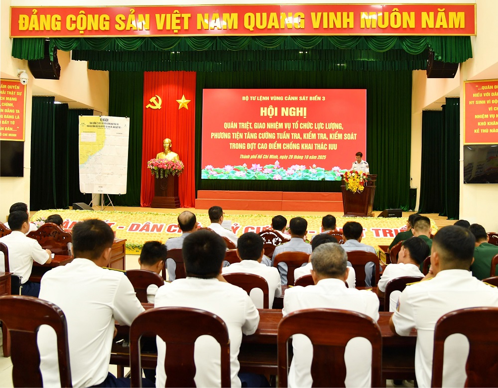 Tối 28/10, tại phường Phước Thắng, thành phố Hồ Chí Minh, Bộ Tư lệnh Vùng Cảnh sát biển 3 tổ chức Hội nghị quán triệt, giao nhiệm vụ cho các lực lượng, phương tiện tăng cường tuần tra, kiểm tra, kiểm soát trong đợt cao điểm chống khai thác hải sản bất hợp pháp, không báo cáo và không theo quy định (IUU). Đại tá Nguyễn Minh Khánh - Phó Tư lệnh, Tham mưu trưởng Bộ Tư lệnh Vùng Cảnh sát biển 3 chủ trì Hội nghị.