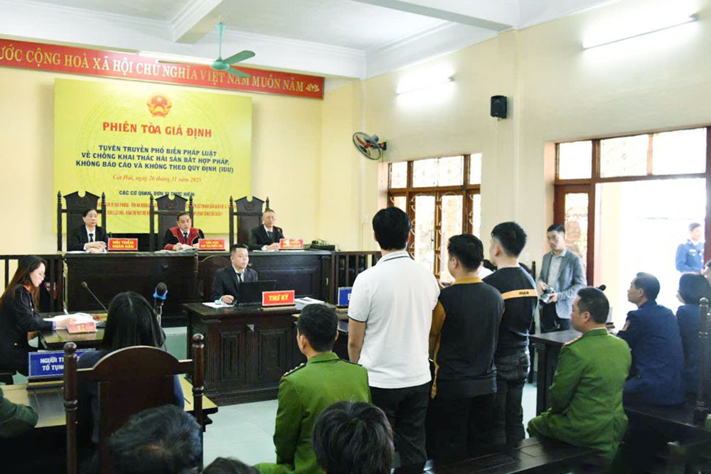 Ngày 26/11, Tòa án nhân dân, Viện kiểm sát nhân dân khu vực 4 - Hải Phòng phối hợp tổ chức phiên tòa giả định xét xử các bị cáo về hành vi mua bán, tàng trữ, sử dụng trái phép vật liệu nổ và hủy hoại nguồn lợi thủy sản. Phiên tòa được xây dựng dựa trên tình huống pháp lý có thật, xảy ra trong thực tế đã được tòa án thụ lý, giải quyết, nhằm giúp người dân hiểu rõ hơn về các hành vi vi phạm trong khai thác thủy sản.