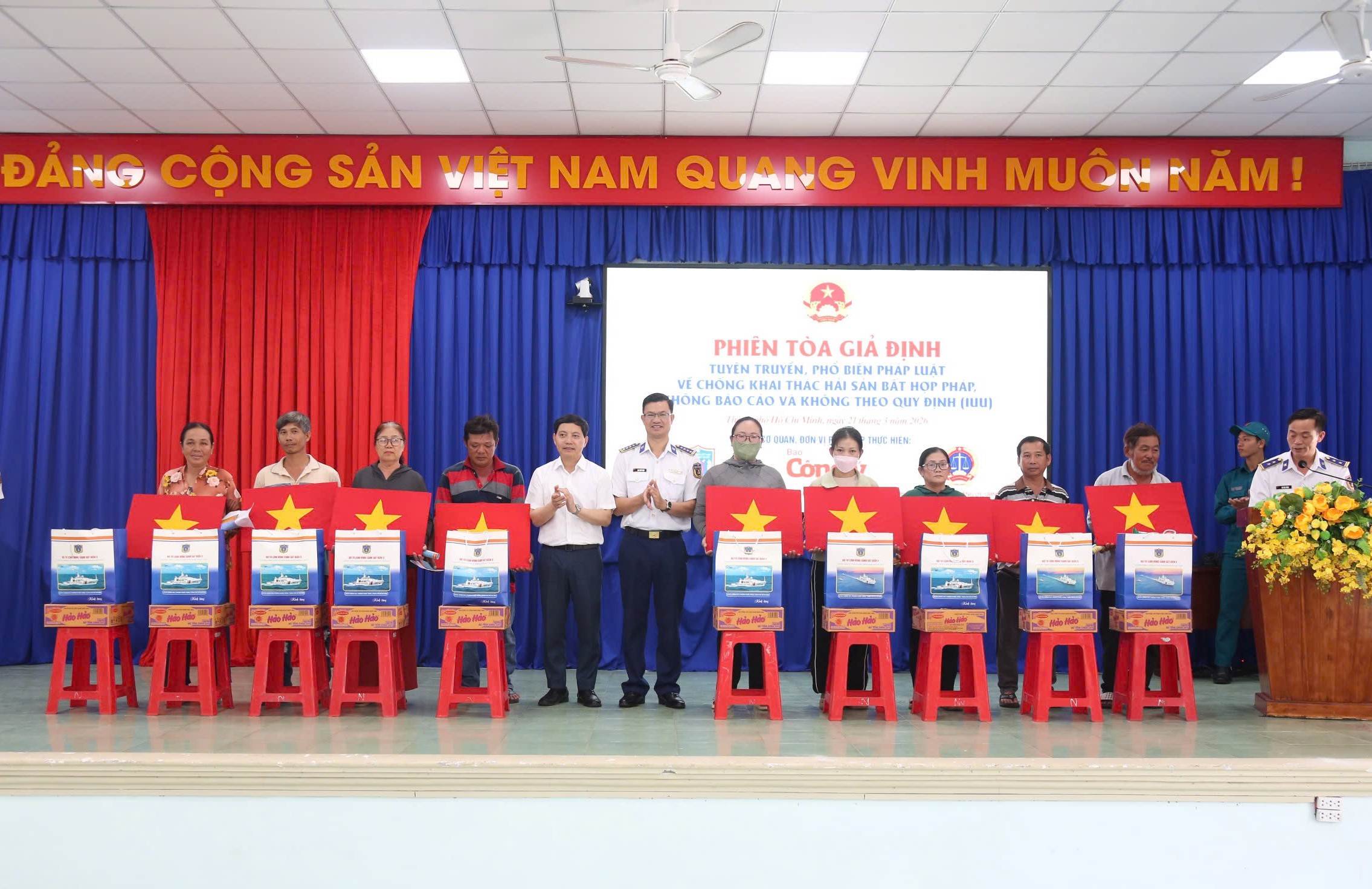Trong hai ngày 20 và 21/3, Bộ Tư lệnh Vùng Cảnh sát biển 3 và Báo Công lý chủ trì, phối hợp với Tòa án nhân dân TP Hồ Chí Minh, Tòa án Quân sự Quân khu 7 và cấp ủy, chính quyền địa phương tổ chức tuyên truyền, phổ biến pháp luật về phòng, chống khai thác hải sản bất hợp pháp, không báo cáo, không theo quy định (IUU) bằng hình thức “phiên tòa giả định” cho hơn 450 ngư dân tại Đặc khu Côn Đảo, xã Bình Châu và xã Phước Hải, Thành phố Hồ Chí Minh.