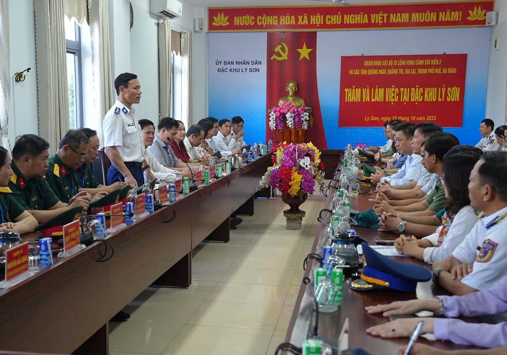 Trong khuôn khổ chuyến khảo sát, nắm tình hình các vùng biển, đảo ven bờ lần thứ hai, năm 2025, ngày 15/10, đoàn công tác Bộ Tư lệnh Vùng Cảnh sát biển 2 và đại diện lãnh đạo các tỉnh, thành phố: Quảng Trị, Huế, Đà Nẵng, Quảng Ngãi, Gia Lai đã đến thăm, làm việc tại đặc khu Lý Sơn (tỉnh Quảng Ngãi).