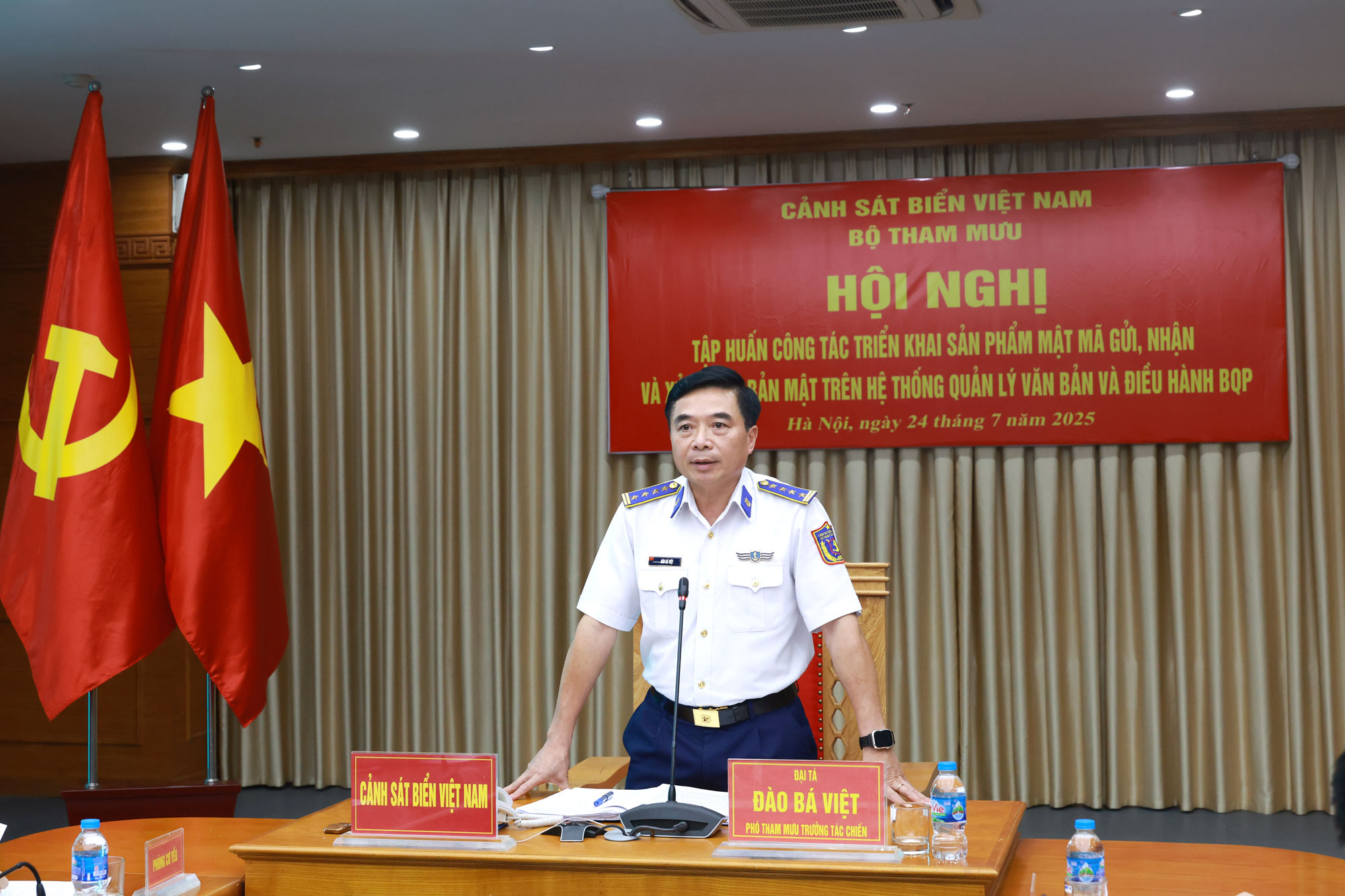 Ngày 24/7, Bộ Tham mưu Cảnh sát biển đã khai mạc Hội nghị tập huấn công tác triển khai sản phẩm mật mã gửi, nhận và xử lý văn bản điện tử có độ mật trên hệ thống quản lý văn bản và điều hành Bộ Quốc phòng. Đại tá Đào Bá Việt - Phó Tham mưu trưởng Cảnh sát biển dự và phát biểu chỉ đạo.