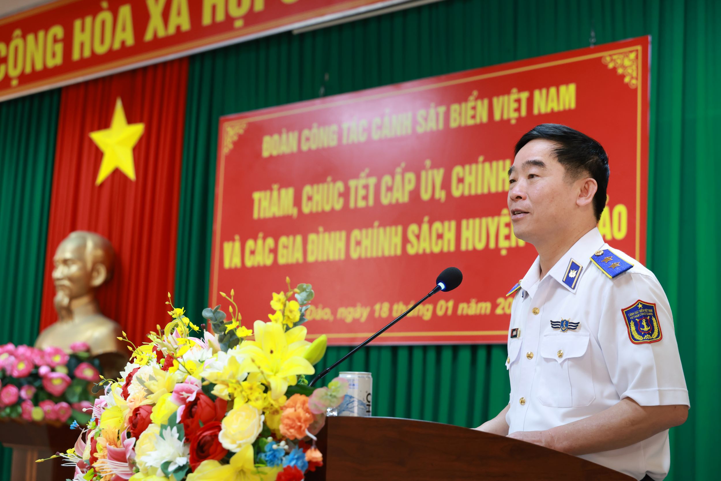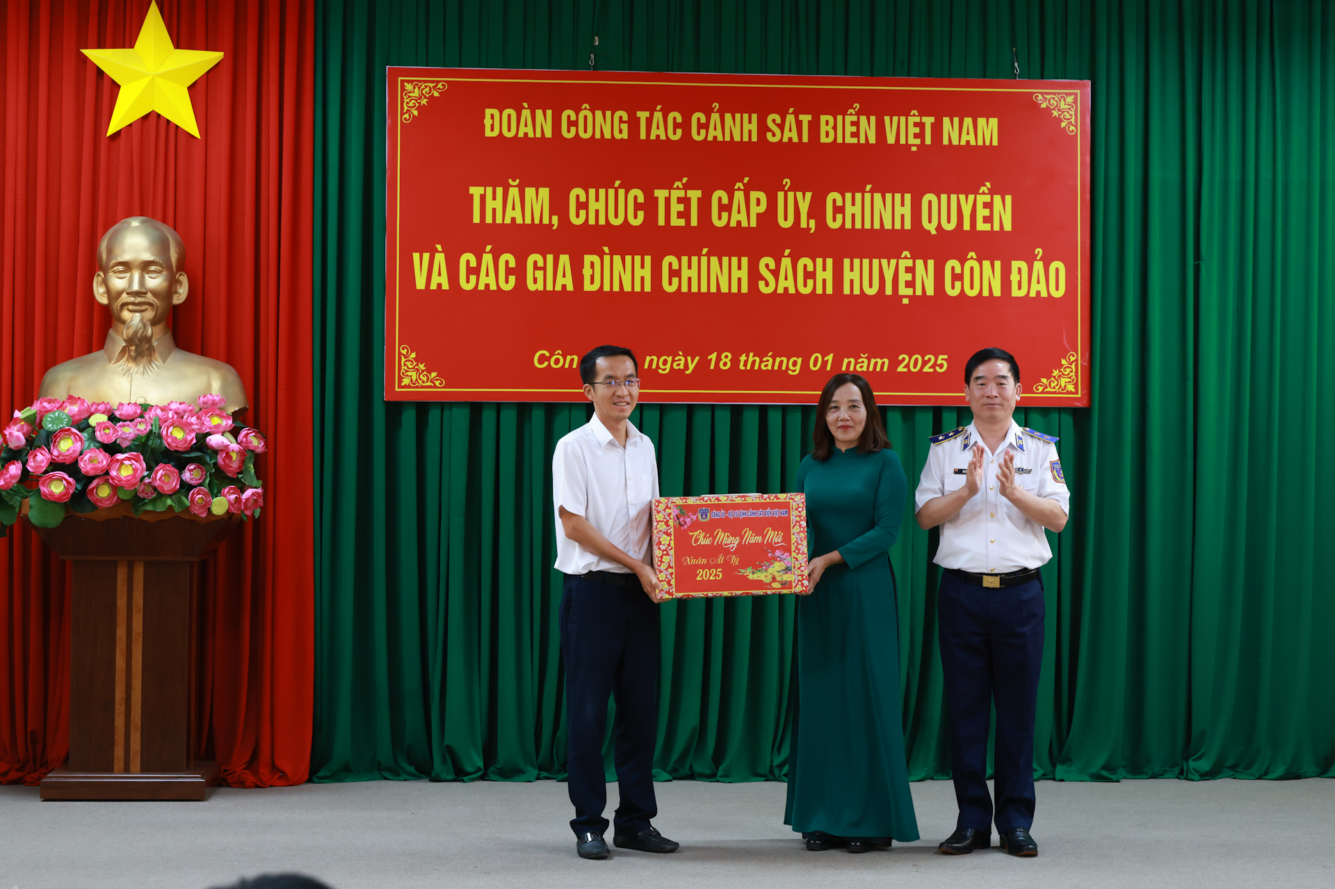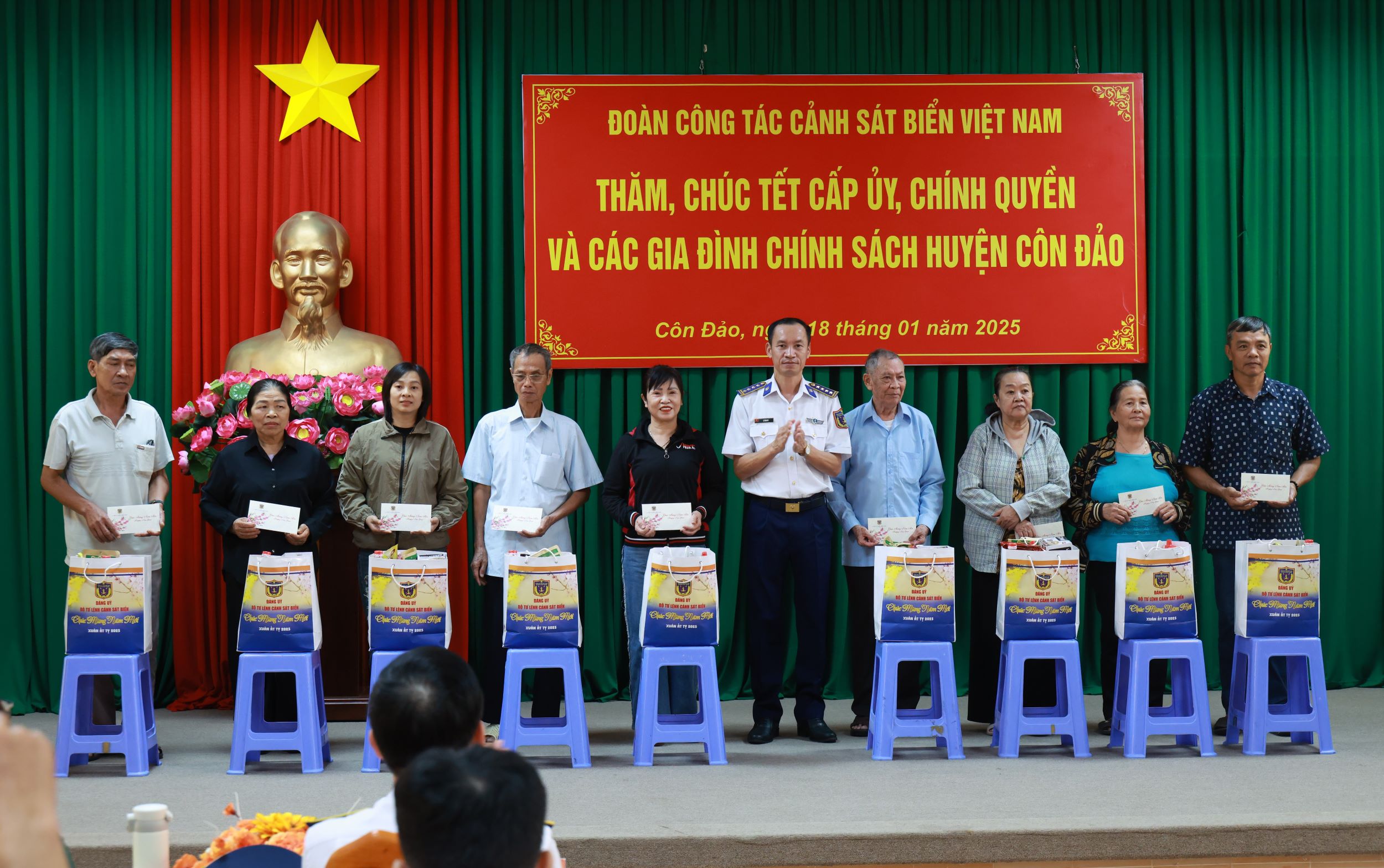 Nằm trong hải trình chuyến công tác kiểm tra thực hiện nhiệm vụ chống khai thác IUU trên vùng biển giáp ranh Việt Nam khu vực biển giáp ranh Việt Nam - Malaysia - Thái Lan, kết hợp kiểm tra công tác SSCĐ, chuẩn bị đón Tết Nguyên đán Ất Tỵ 2025 một số đơn vị, ngày 18/1, Trung tướng Bùi Quốc Oai - Bí thư Đảng ủy, Chính ủy Cảnh sát biển Việt Nam làm trưởng đoàn công tác đến thăm, tặng quà chúc Tết các cơ quan quân - dân chính huyện Côn Đảo, tỉnh Bà Rịa - Vũng Tàu.