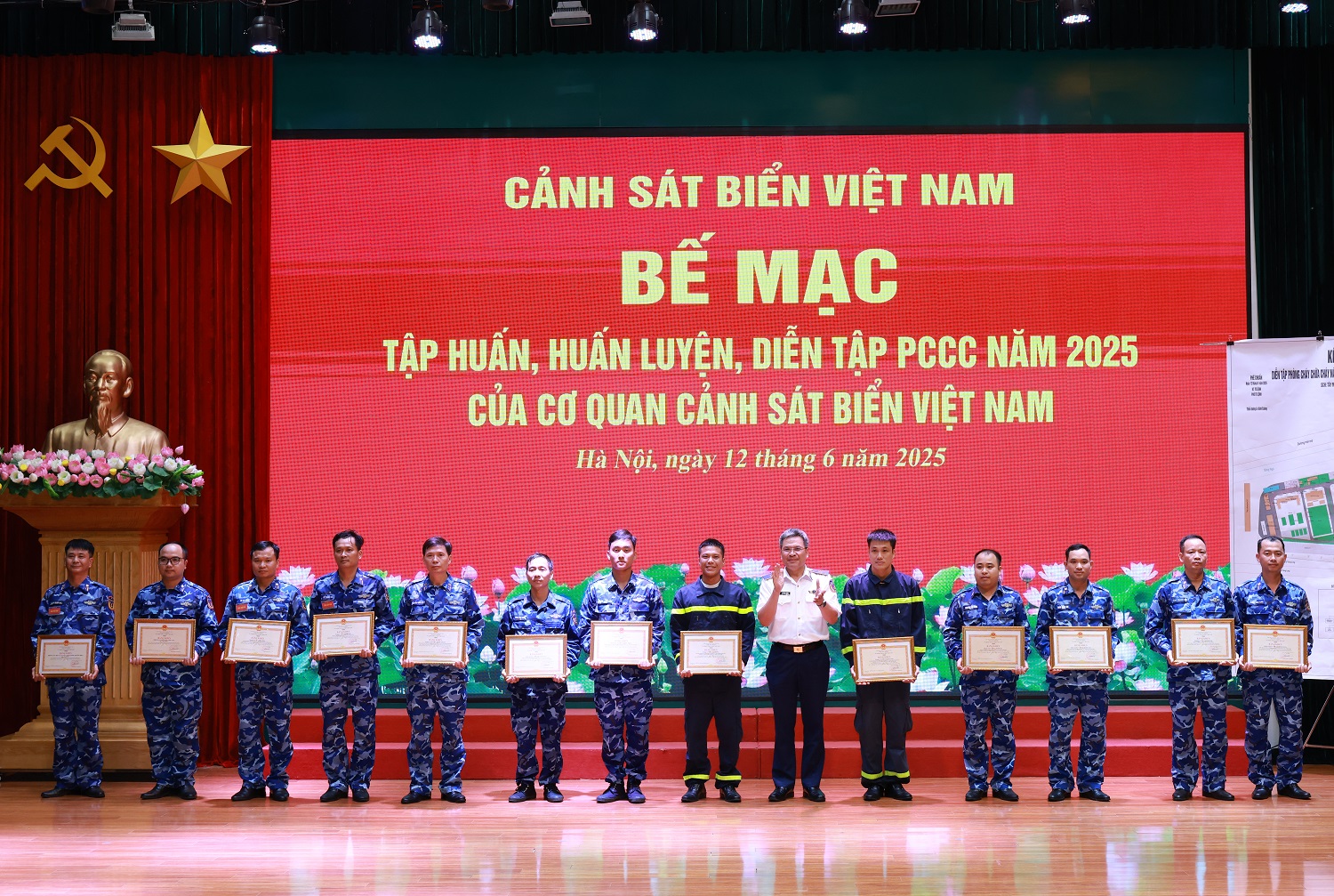 Dịp này, Cảnh sát biển Việt Nam đã biểu dương, khen thưởng 2 tập thể và 11 cá nhân vì đã có thành tích xuất sắc trong tham gia tổ chức và phối hợp thực hành diễn tập phương án PCCC năm 2025.
