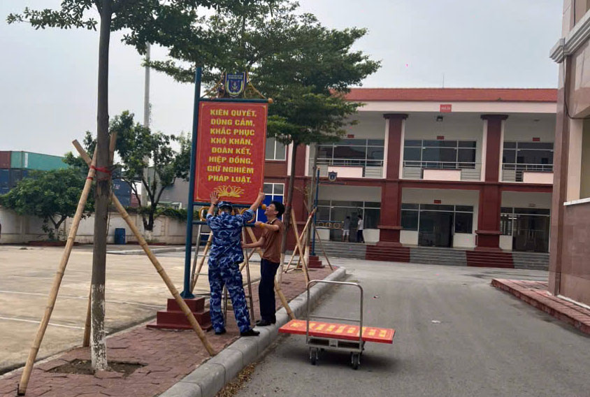 Tháo dỡ pano trong khuôn viên doanh trại bảo đảm an toàn trước cơn bão.
