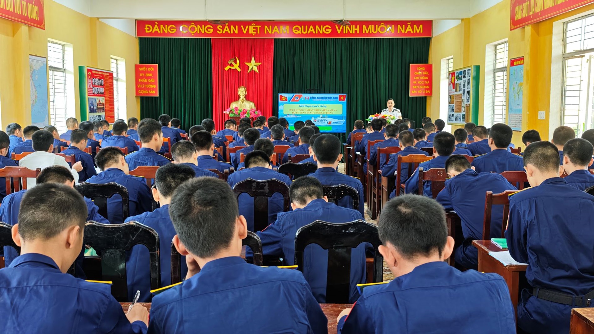 Chiến sĩ mới Vùng Cảnh sát biển 2 trong lớp giáo dục truyền thống đơn vị.