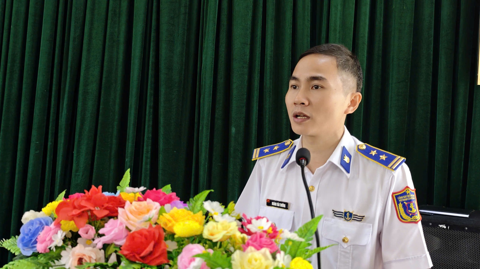 Trung tá Hoàng Văn Thường - Trưởng ban Tuyên huấn/ Vùng Cảnh sát biển 2 giáo dục truyền thống đơn vị cho chiến sĩ mới năm 2026.
