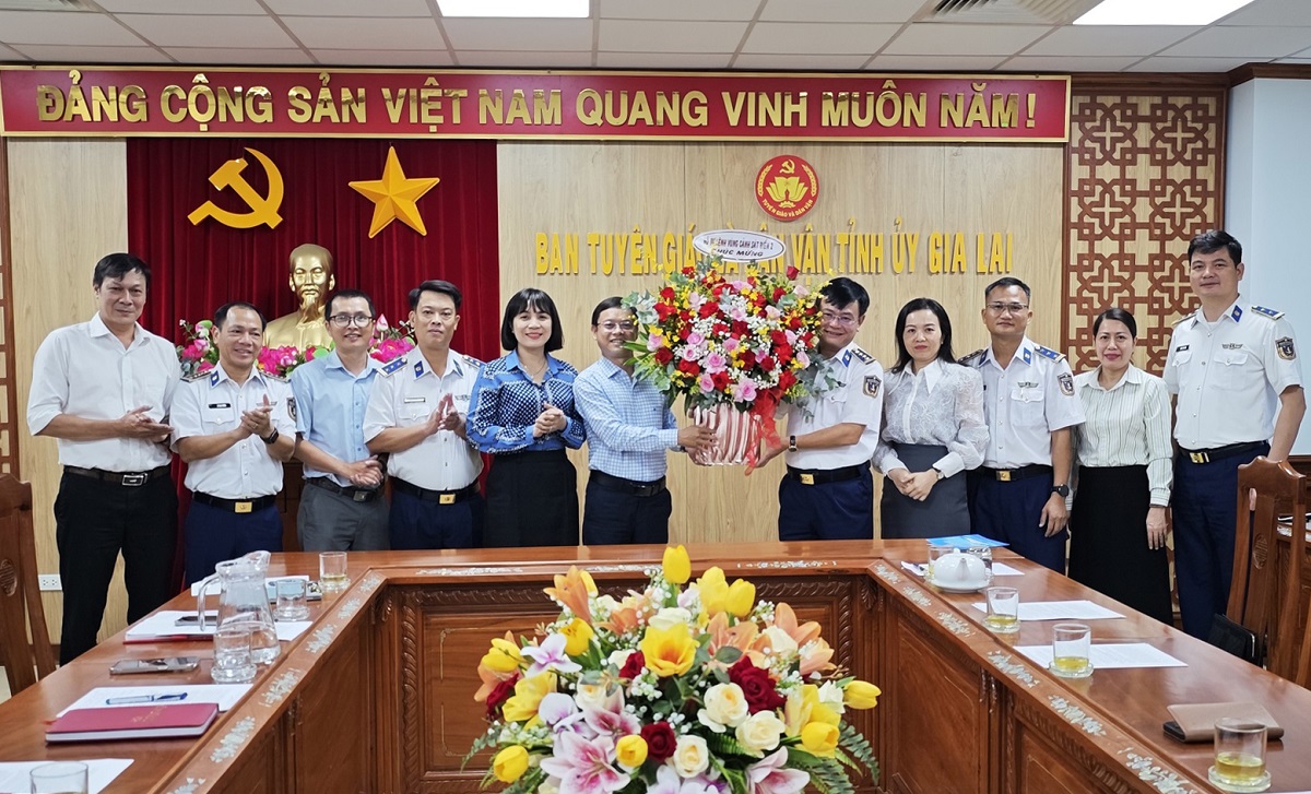 Đoàn công tác tặng hoa chúc mừng Ban Tuyên giáo và Dân vận Tỉnh ủy Gia Lai.