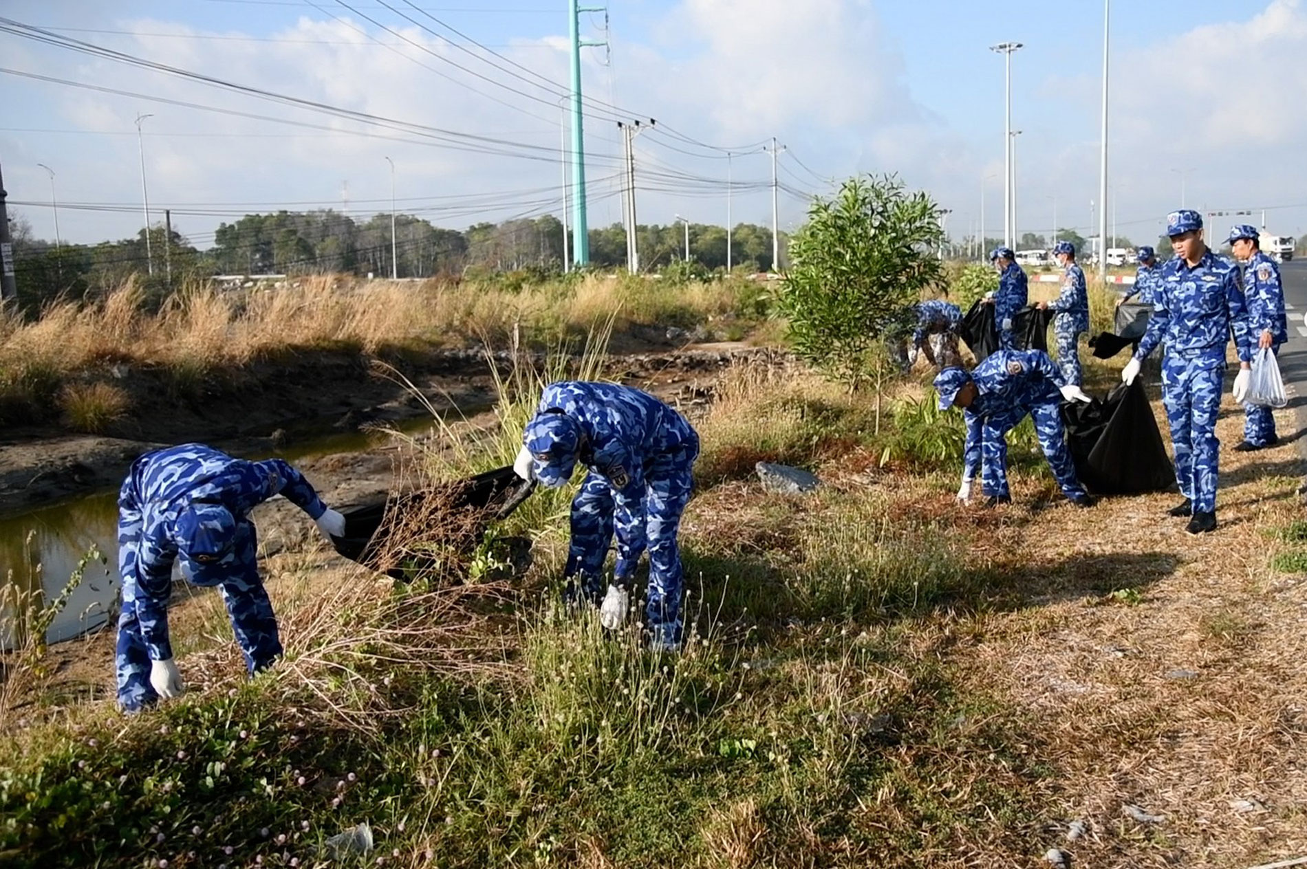 Cán bô, chiến sĩ Bộ Tư lệnh Vùng Cảnh sát biển 3 tham gia thu gom rác thải, làm sạch các tuyến đường.