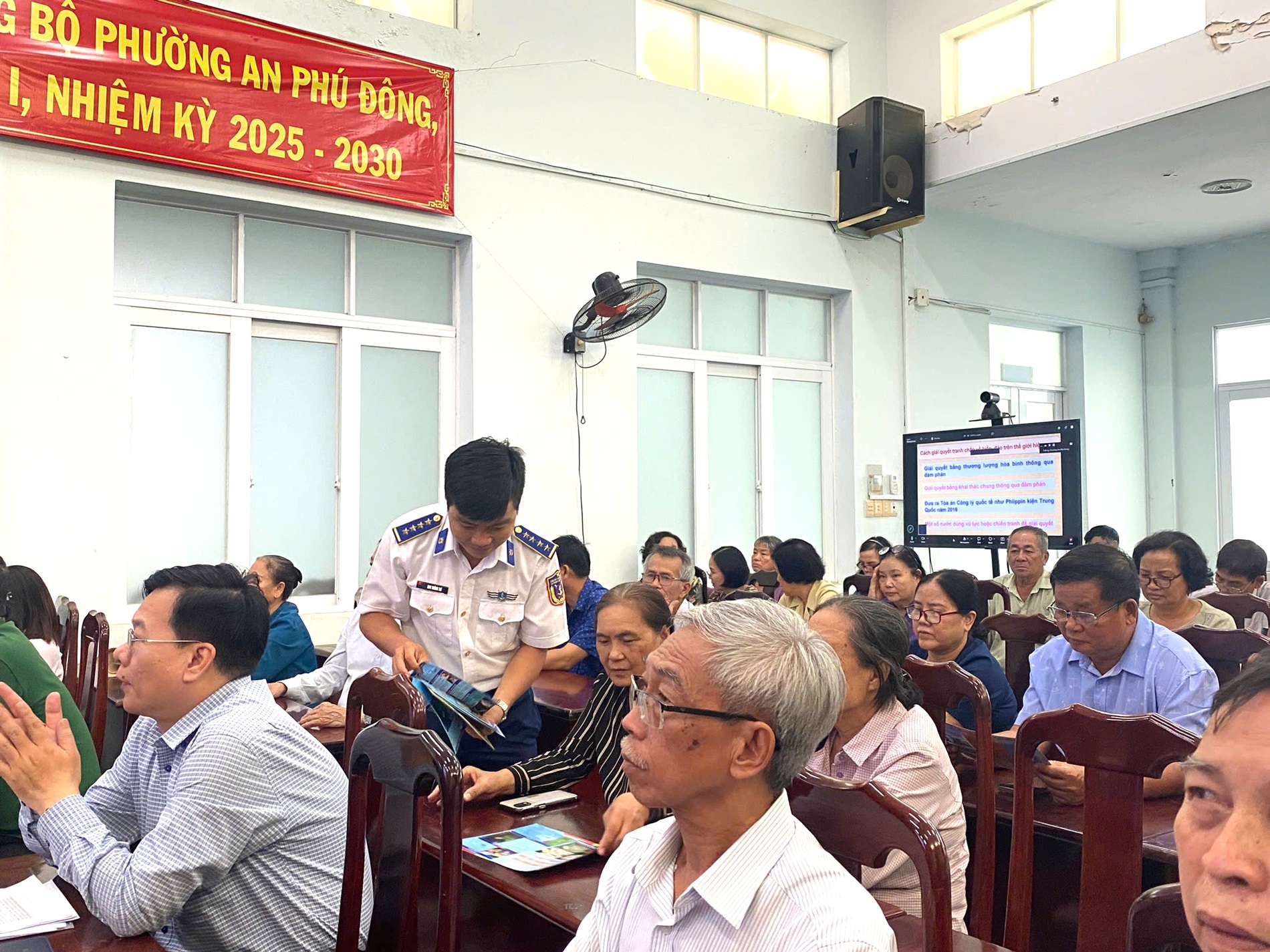 Trước đó, ngày 27/3, Bộ Tư lệnh Vùng Cảnh sát biển 3 đã phối hợp Thường trực Đảng ủy, UBND phường An Phú Đông (TP. Hồ Chí Minh) tổ chức Hội nghị tuyên truyền về biển, đảo; phòng, chống khai thác IUU và tác hại của ma túy cho hơn 870 cán bộ, đảng viên và nhân dân trên địa bàn. Hội nghị được tổ chức trực tiếp tại hội trường UBND phường, đồng thời kết nối trực tuyến tới 8 điểm cầu. Nhân dịp này, đơn vị đã cấp phát hơn 500 tờ rơi tuyên truyền về chống khai thác IUU và phòng, chống tác hại của ma túy cho nhân dân.