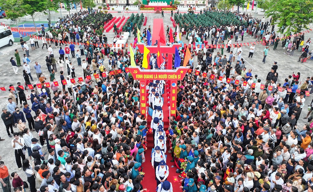Các chiến sĩ mới bước qua Cổng vinh quang, sẵn sàng lên đường thực hiện nhiệm vụ bảo vệ Tổ quốc.