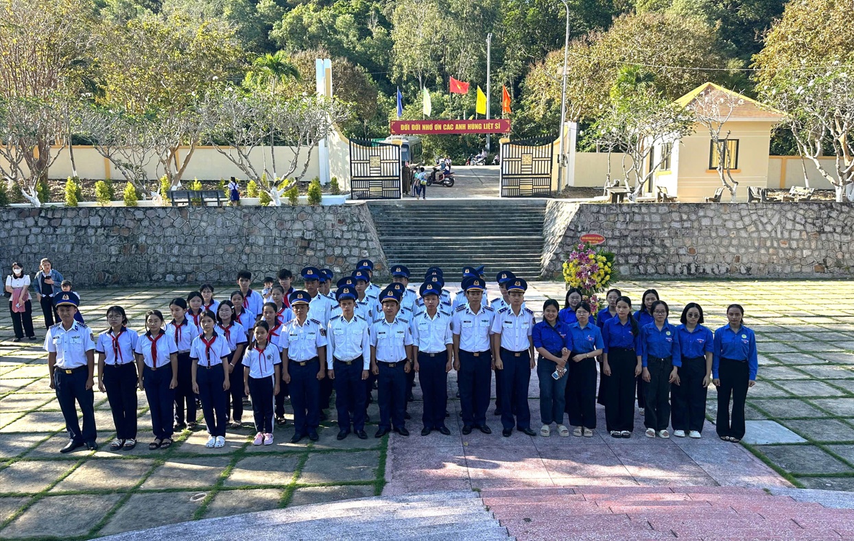 Cán bộ, chiến sĩ đơn vị phối hợp với địa phương tổ chức dâng hương, dâng hoa tại Di tích lịch sử tượng đài Nắm Đấm, đặc khu Phú Quốc.