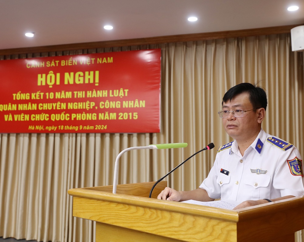 Báo cáo trung tâm tại Hội nghị đánh giá: Kể từ khi Luật được Quốc hội khóa XIII thông qua ngày 26/11/2015 (có hiệu lực thi hành từ ngày 1/7/2016) đến nay, Đảng ủy, Thủ trưởng Cảnh sát biển Việt Nam đã lãnh đạo, chỉ đạo, quán triệt, triển khai và tổ chức thực hiện nghiêm túc, có hiệu quả Luật và các văn bản hướng dẫn thi hành; trong tiến trình thực hiện Luật, cấp ủy, chỉ huy các cơ quan, đơn vị đã chủ động nghiên cứu, đề xuất và hướng dẫn thực hiện tốt Luật và các văn bản hướng dẫn thi hành; thực hiện tốt công tác tuyên truyền, phổ biến, giáo dục cho đội ngũ quân nhân chuyên nghiệp, viên chức quốc phòng để nâng cao nhận thức nắm, hiểu Luật và các văn bản quy phạm pháp luật có liên quan.