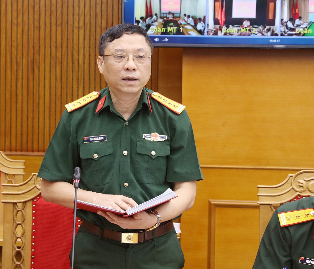 Đại tá Trần Quang Thanh - Phó Cục trưởng Cục Chính sách/Tổng cục Chính trị Quân đội nhân dân Việt Nam phát biểu tại Hội nghị.