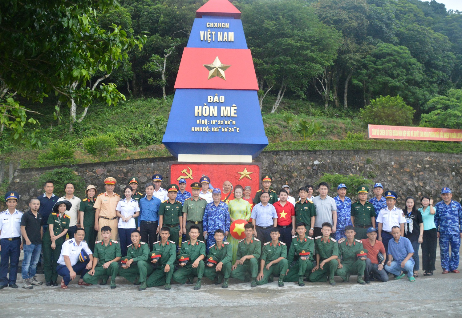 Các đại biểu chụp ảnh lưu niệm cùng cán bộ, chiến sĩ Tiểu đoàn hỗn hợp đảo Hòn Mê.