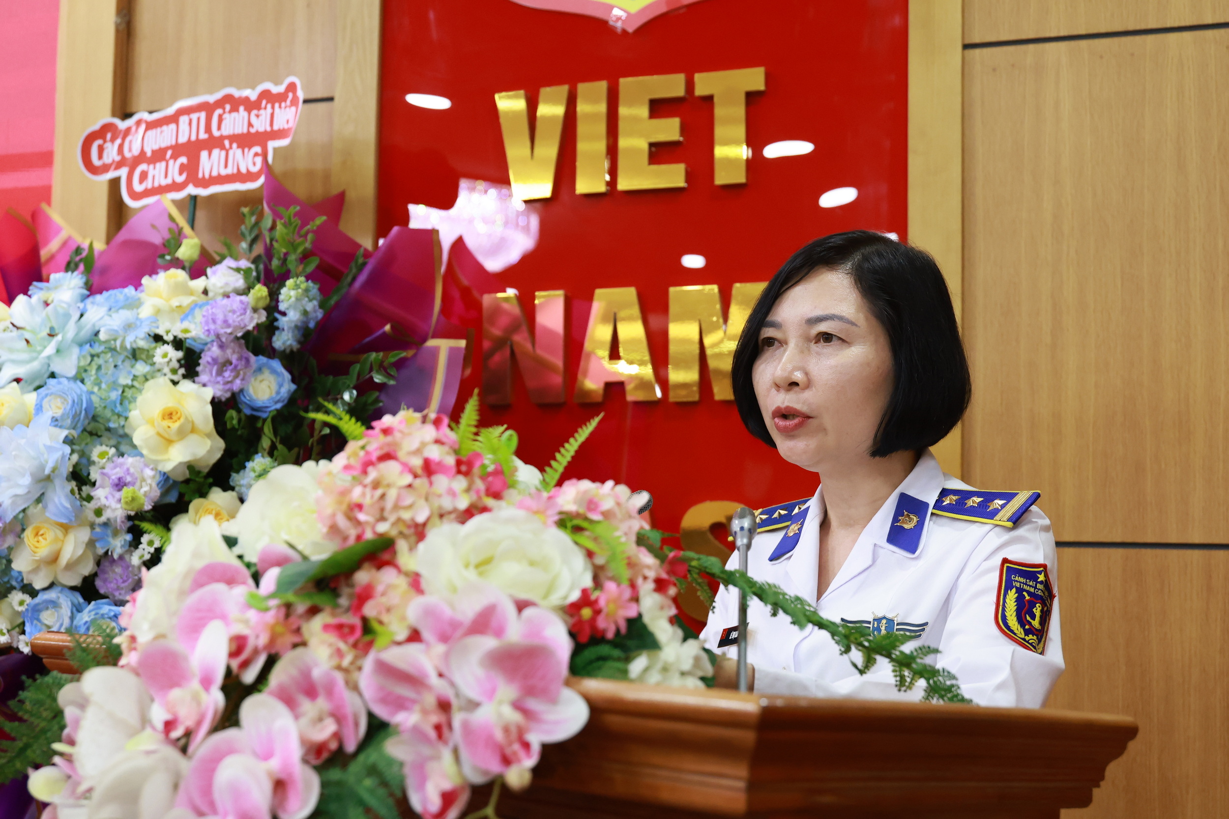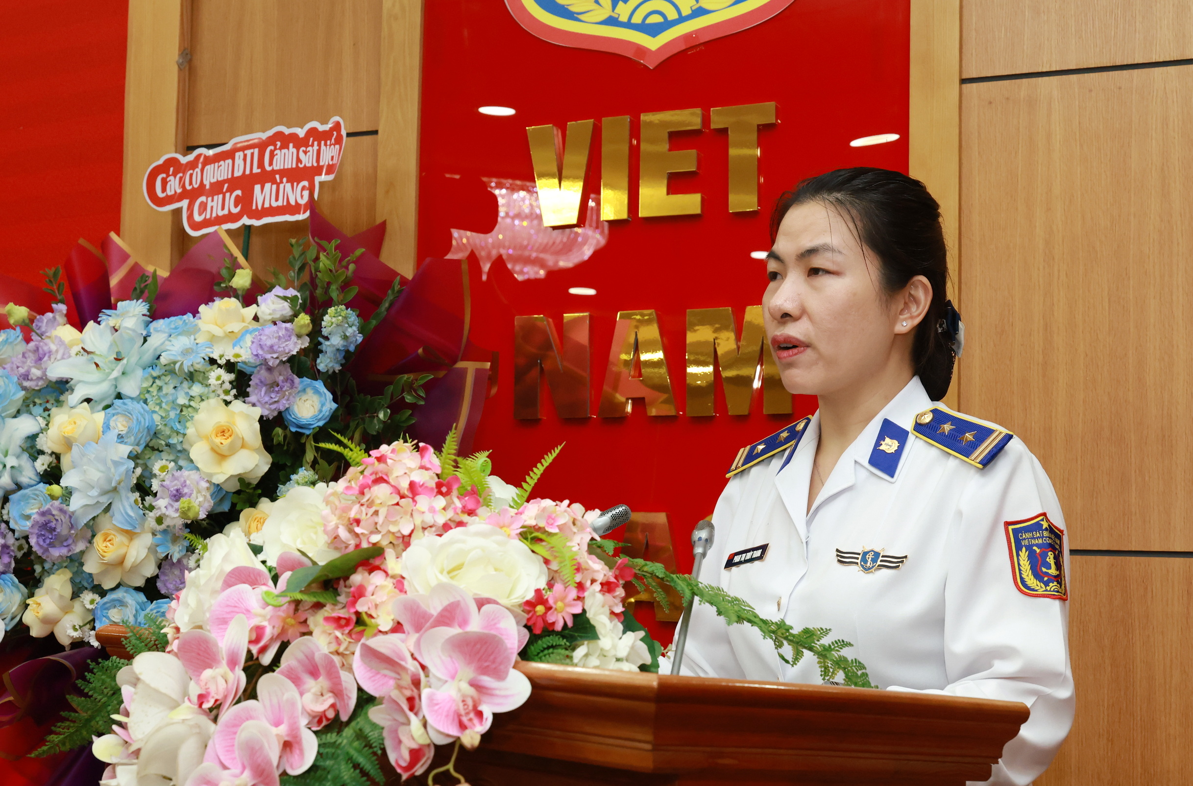 Trung tá Phan Thị Thùy Trang - Trưởng phòng Tài chính Cảnh sát biển phát biểu tại buổi gặp mặt.