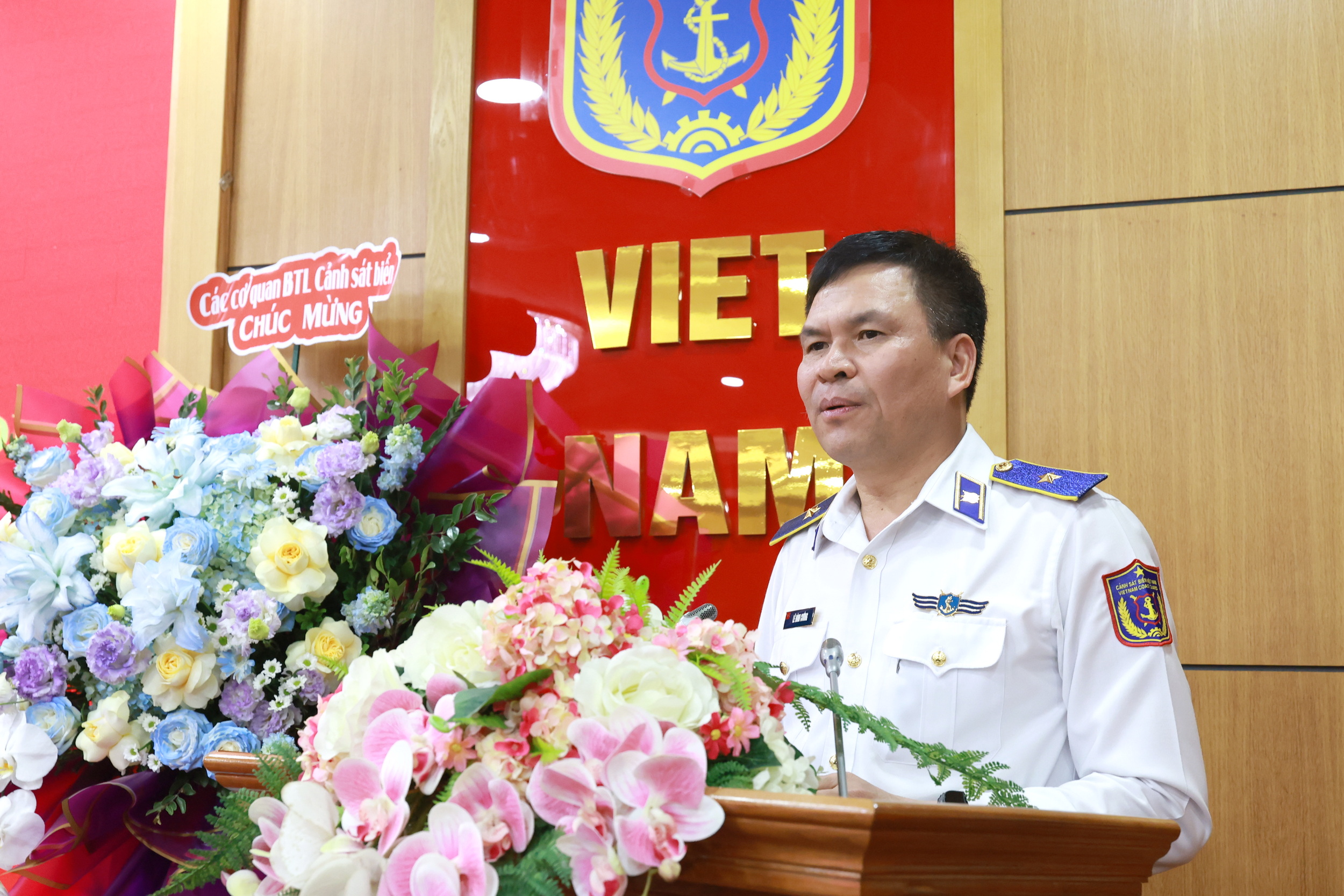 Thủ trưởng Bộ Tư lệnh Cảnh sát biển trao tặng lẵng hoa chúc mừng Ngành Tài chính Cảnh sát biển.