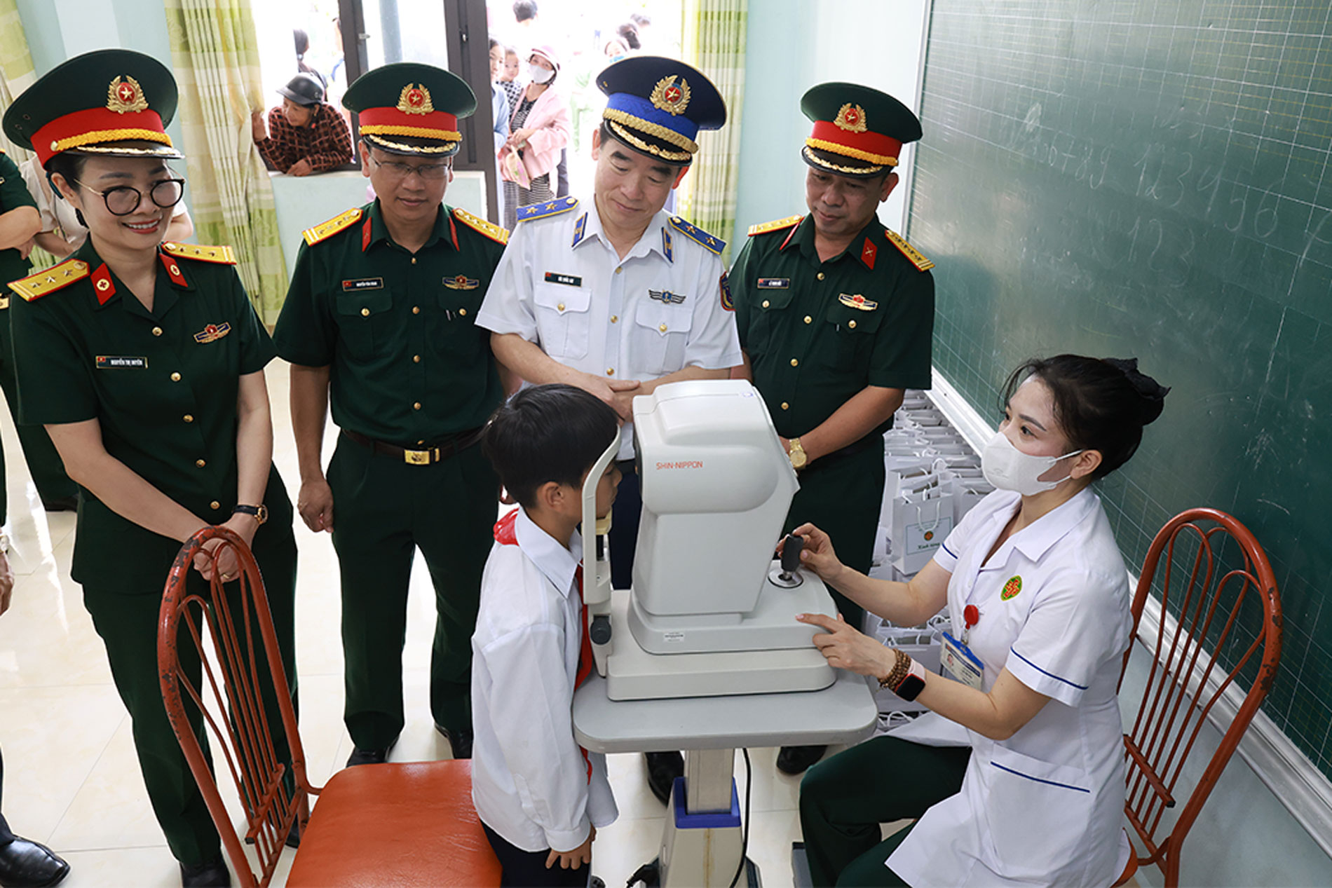 Phối hợp với Bệnh viện Quân y 354/Tổng cục Hậu Cần - Kỹ thuật tổ chức khám mắt, cấp phát thuốc miễn phí cho các cháu học sinh Trường Tiểu học Cô Tô.