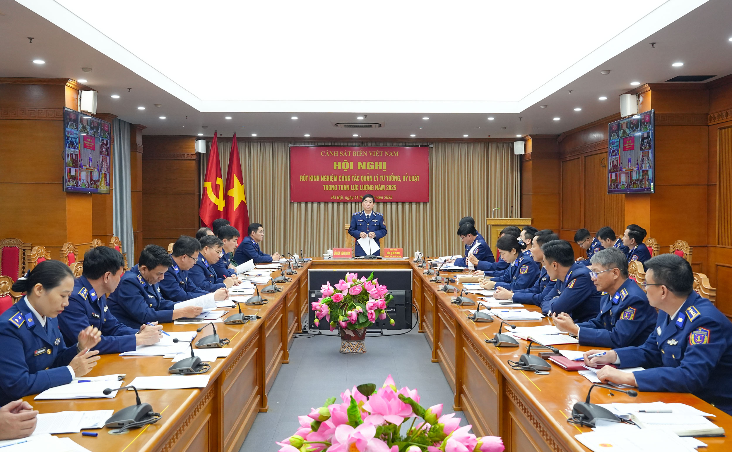 Ngày 11/12, Cảnh sát biển Việt Nam tổ chức Hội nghị rút kinh nghiệm công tác quản lý tư tưởng, kỷ luật trong toàn Lực lượng năm 2025, theo hình thức trực tiếp kết hợp trực tuyến, tại Sở Chỉ huy Bộ Tư lệnh Cảnh sát biển và 13 điểm cầu các đơn vị. Trung tướng Bùi Quốc Oai - Bí thư Đảng ủy, Chính ủy Cảnh sát biển Việt Nam chủ trì hội nghị.
