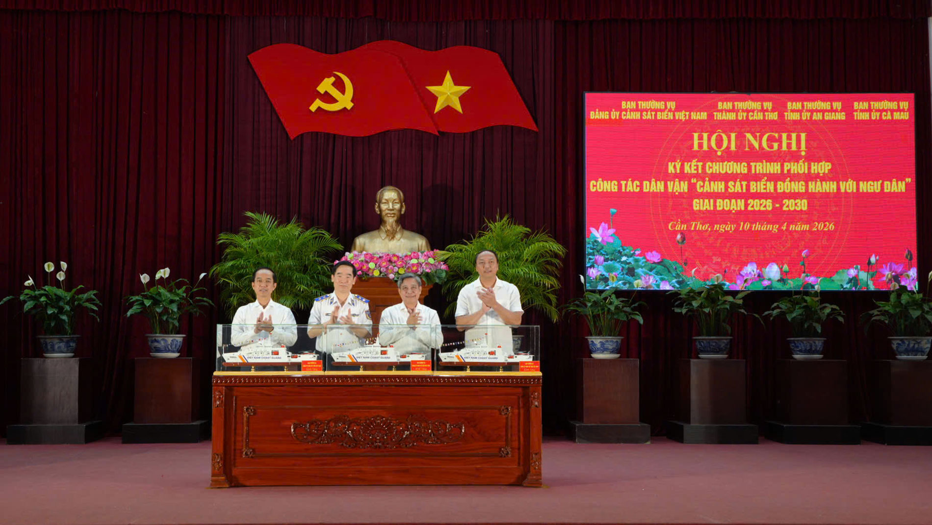 Chiều 10/4, tại phường Ninh Kiều (TP. Cần Thơ), Ban Thường vụ Đảng ủy Cảnh sát biển Việt Nam đã ký kết Chương trình phối hợp công tác dân vận “Cảnh sát biển đồng hành với ngư dân”, giai đoạn 2026 - 2030 với Ban Thường vụ Thành ủy Cần Thơ, Tỉnh ủy An Giang và Tỉnh ủy Cà Mau.