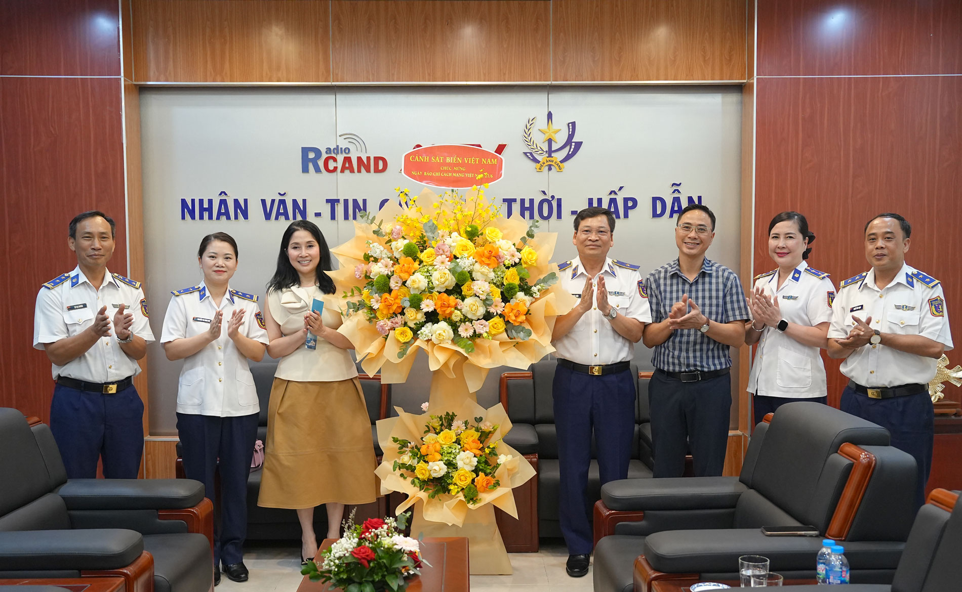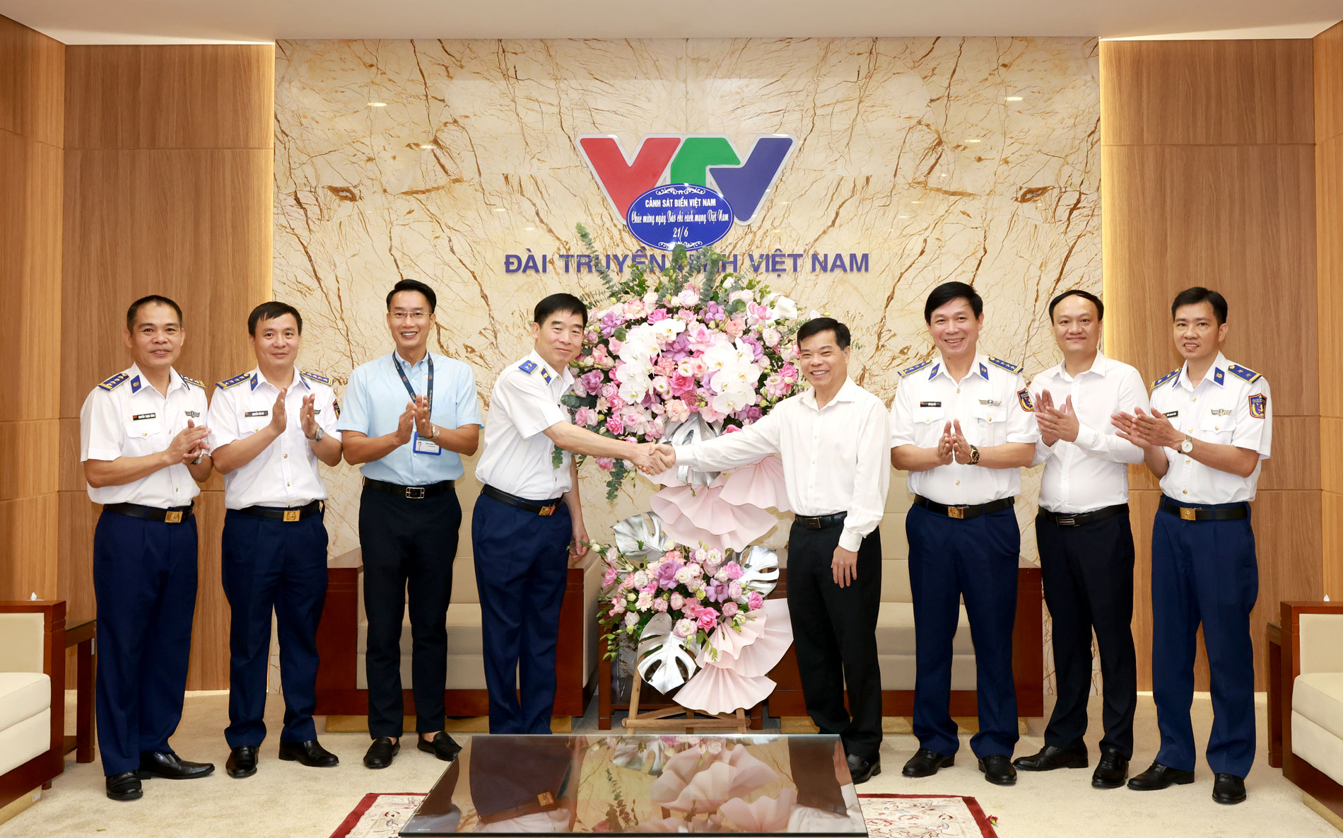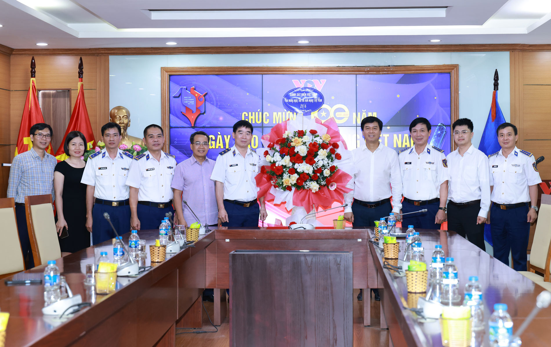 Đoàn công tác Cảnh sát biển Việt Nam đến tặng hoa chúc mừng Đài Tiếng nói Việt Nam nhân dịp kỷ niệm 100 năm Ngày Báo chí Cách mạng Việt Nam.