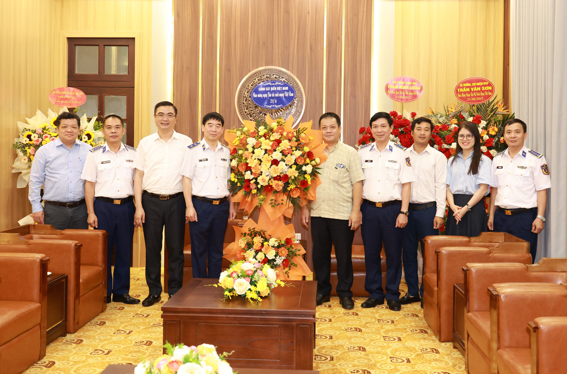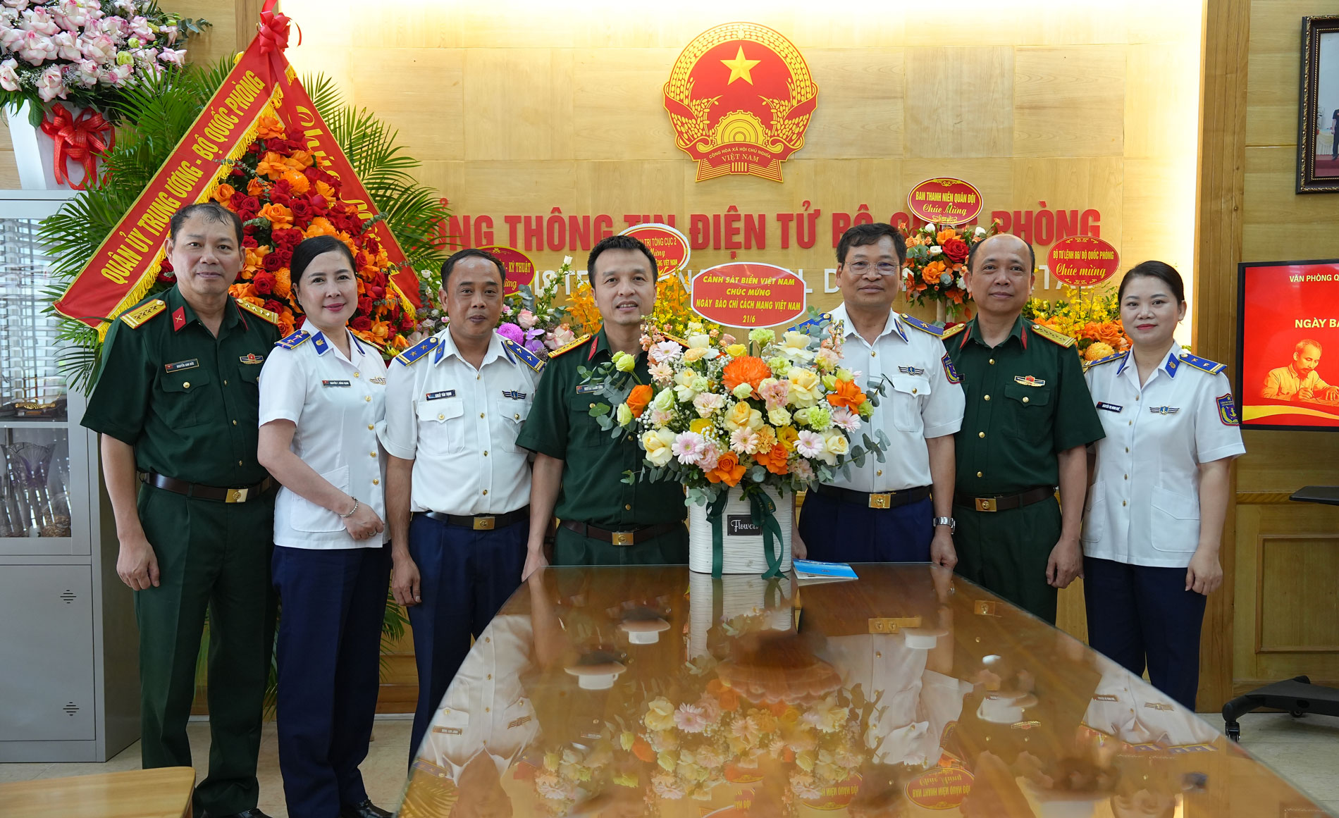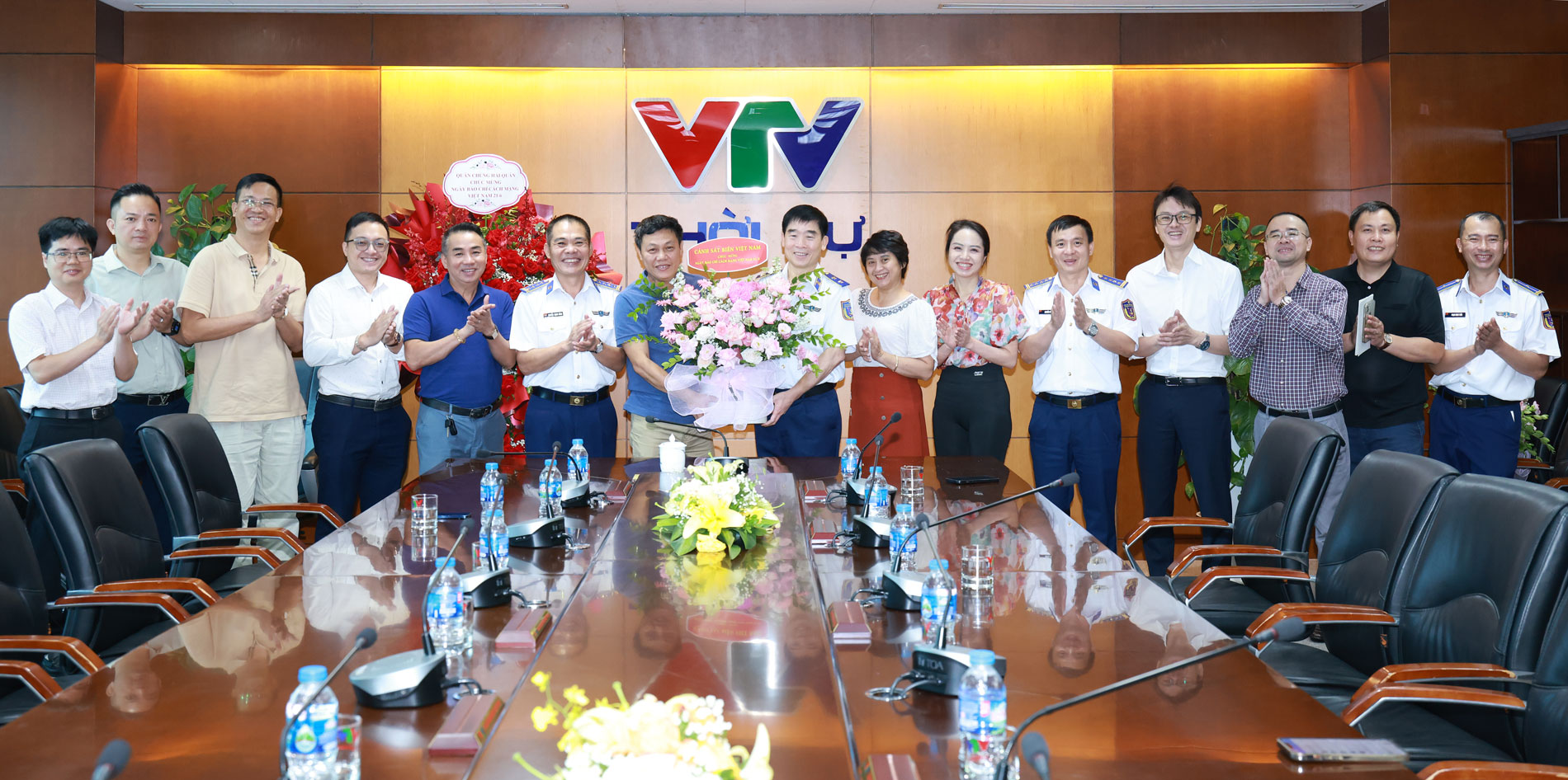 Đoàn công tác Cảnh sát biển Việt Nam đến tặng hoa chúc mừng Đài Tiếng nói Việt Nam nhân dịp kỷ niệm 100 năm Ngày Báo chí Cách mạng Việt Nam.