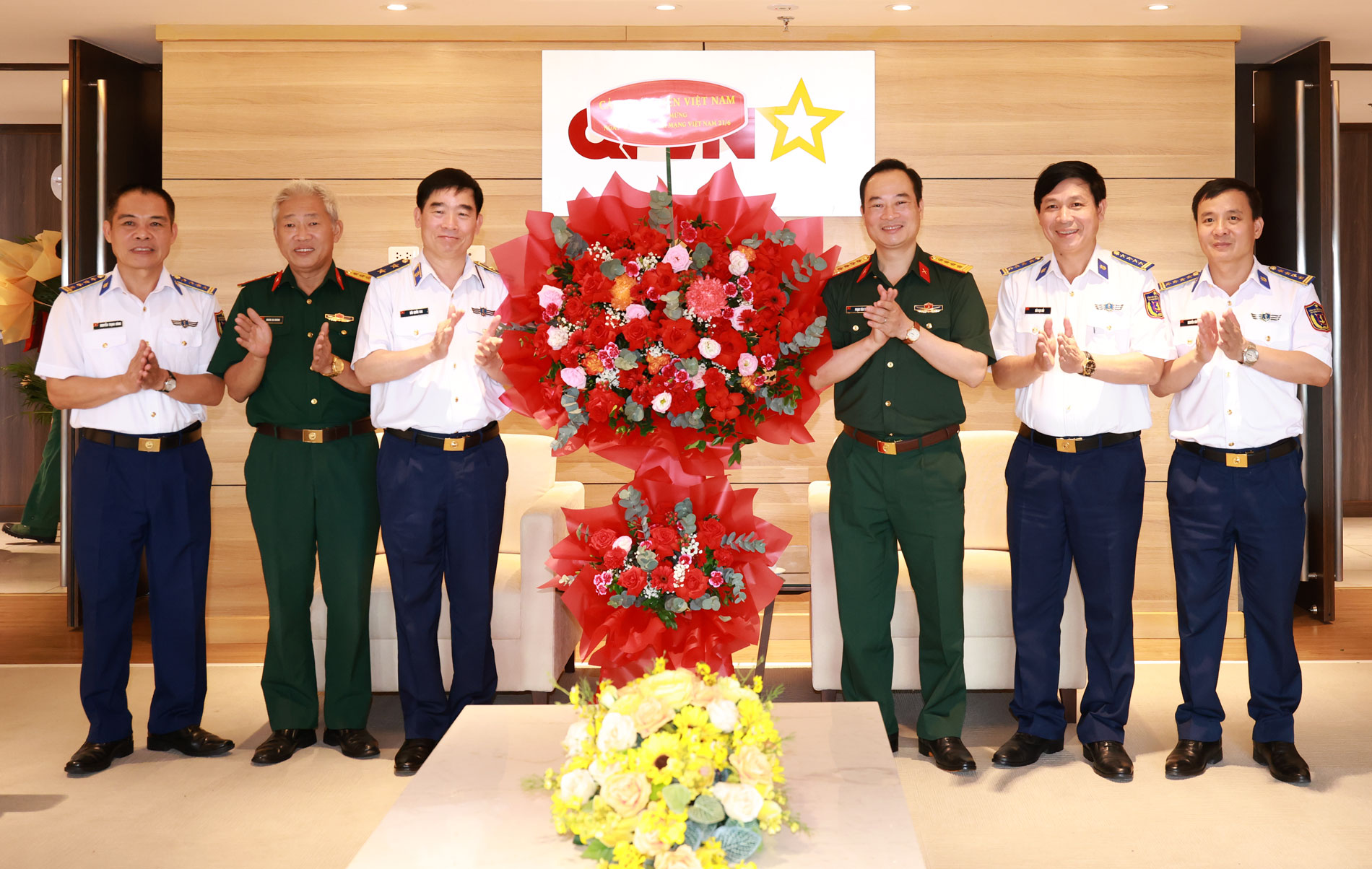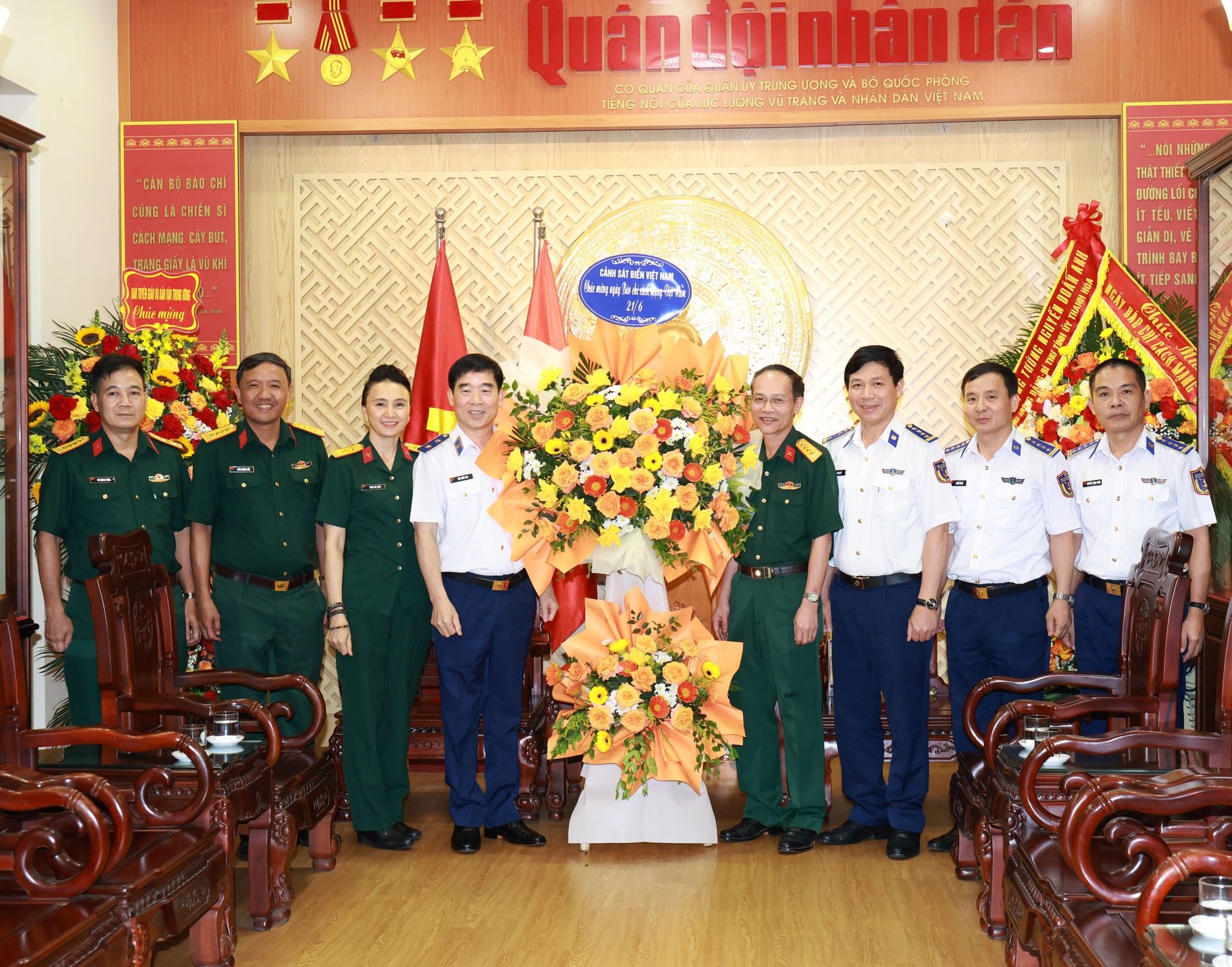 Đoàn công tác Cảnh sát biển Việt Nam đến tặng hoa chúc mừng Trung tâm Phát thanh - Truyền hình Quân đội và Báo Quân đội nhân dân.