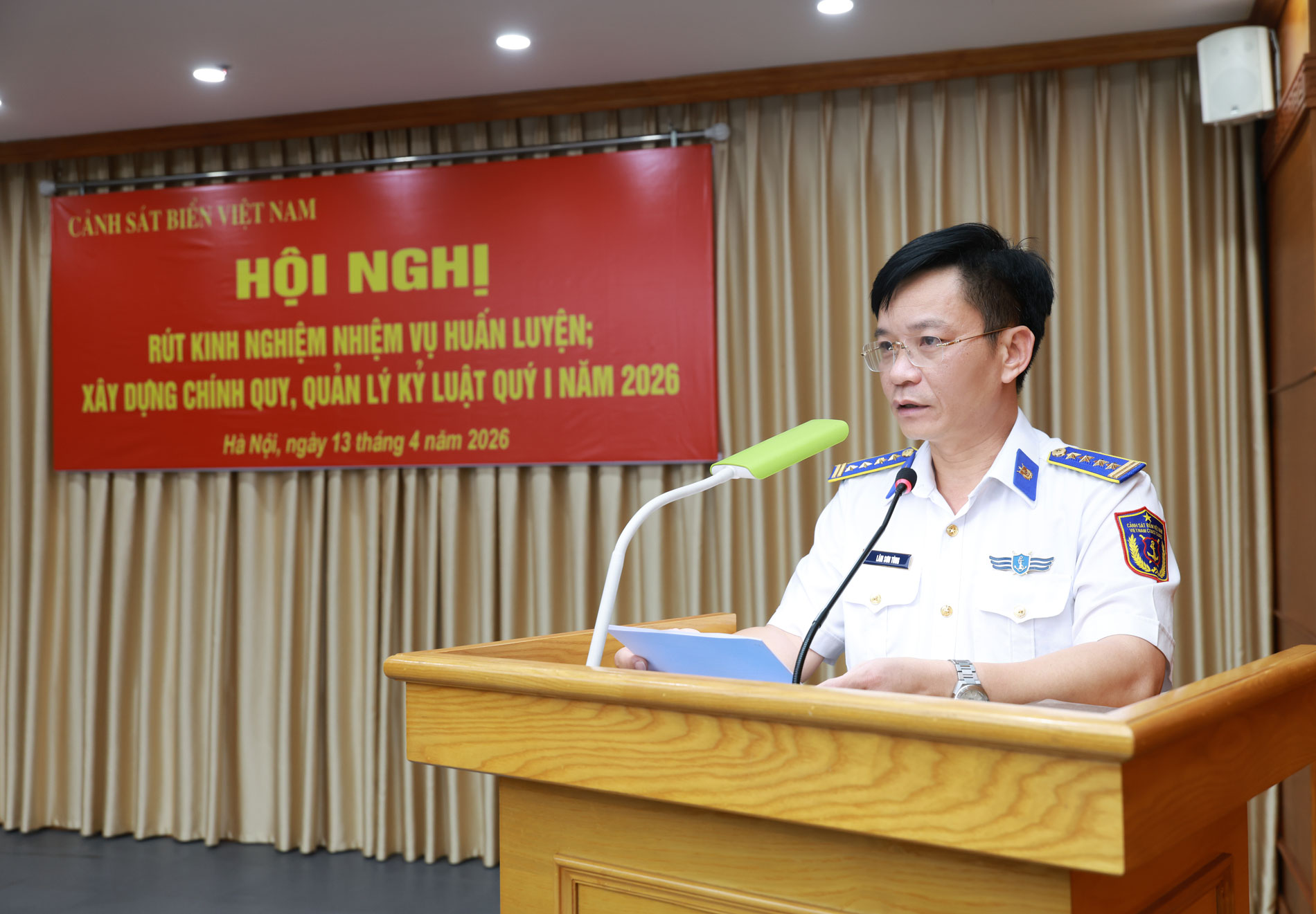 Đại tá Lâm Sơn Tùng - Phó Tham mưu trưởng Cảnh sát biển báo cáo kết quả công tác huấn luyện; xây dựng chính quy, quản lý kỷ luật Quý I năm 2026.