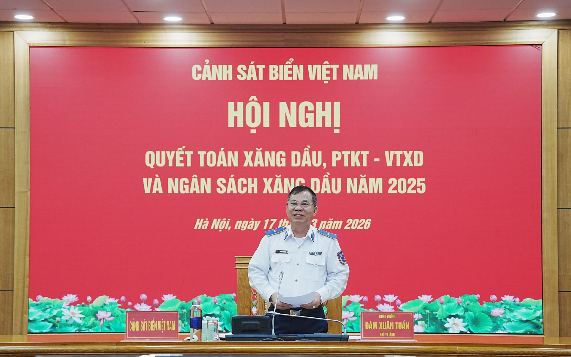 Chiều 17/3, Cảnh sát biển Việt Nam tổ chức Hội nghị Quyết toán xăng dầu, phương tiện kỹ thuật - vật tư xăng dầu (PTKT - VTXD) và ngân sách xăng dầu năm 2025. Thiếu tướng Đàm Xuân Tuấn - Phó Tư lệnh, Chủ tịch Hội đồng thanh quyết toán xăng dầu Cảnh sát biển chủ trì Hội nghị. Tham dự Hội nghị có đại diện Thủ trưởng các cơ quan chức năng và đơn vị trong toàn Lực lượng.