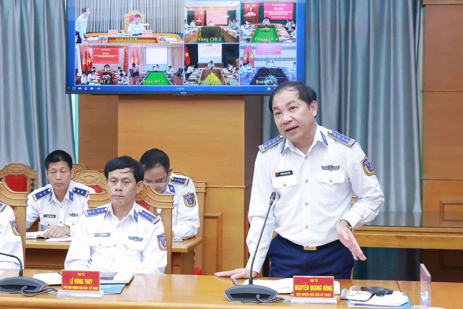 Đại tá Nguyễn Quang Hùng - Chủ nhiệm Hậu cần - Kỹ thuật Cảnh sát biển phát biểu tại Hội nghị.