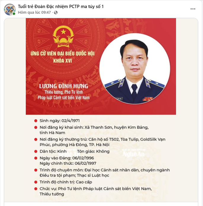 Đoàn cơ sở Đoàn Đặc nhiệm PCTP ma túy số 1 tuyên truyền tiểu sử Thiếu tướng Lương Đình Hưng - Phó Tư lệnh Pháp luật Cảnh sát biển Việt Nam ứng cử đại biểu Quốc hội khóa XVI thông qua mạng xã hội.