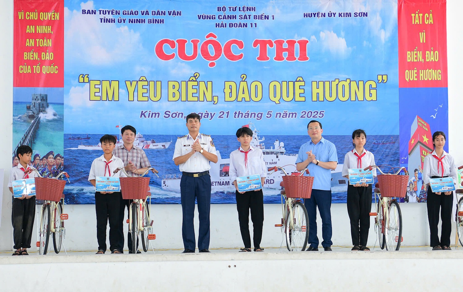 Chiều cùng ngày, Hải đoàn 11 phối hợp với các đơn vị tổ chức Cuộc thi “Em yêu biển, đảo quê hương”. Tham gia cuộc thi có 60 học sinh xuất sắc của trường THCS Đông Hải và trường THCS Kim Trung (huyện Kim Sơn). Các thí sinh tham gia tranh tài theo hình thức “Rung chuông vàng”, dạng câu hỏi trắc nghiệm với 4 phần thi: “Ra khơi”, “Vượt sóng”, “Cập bến” và “Đặt mốc chủ quyền”. Nội dung các câu hỏi tập trung vào kiến thức cơ bản về biển, đảo Việt Nam; Luật Biển Việt Nam năm 2012; Luật Cảnh sát biển Việt Nam 2018 và truyền thống Lực lượng Cảnh sát biển Việt Nam; các quy định về chống khai thác hải sản bất hợp pháp, không báo cáo và không theo quy định (IUU); công tác phòng, chống ma túy, bạo lực học đường; các kiến thức về truyền thống lịch sử, văn hóa, địa lý tỉnh Ninh Bình. Kết quả, học sinh Trần Thị Lan Hương - Lớp 7A, trường THCS Kim Trung đã xuất sắc giành giải Nhất của Cuộc thi. Ban Tổ chức cũng đã trao 2 giải Nhì, 3 giải Ba, 5 giải Khuyến khích tặng các thí sinh đạt thành tích cao tại Cuộc thi.
