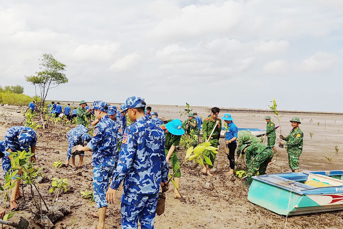 Đoàn viên thanh niên Hải đoàn 42 cùng Đoàn xã Phan Ngọc Hiển tiến hành trồng cây ngăn xói lở, chống xâm nhập mặn bờ biển.