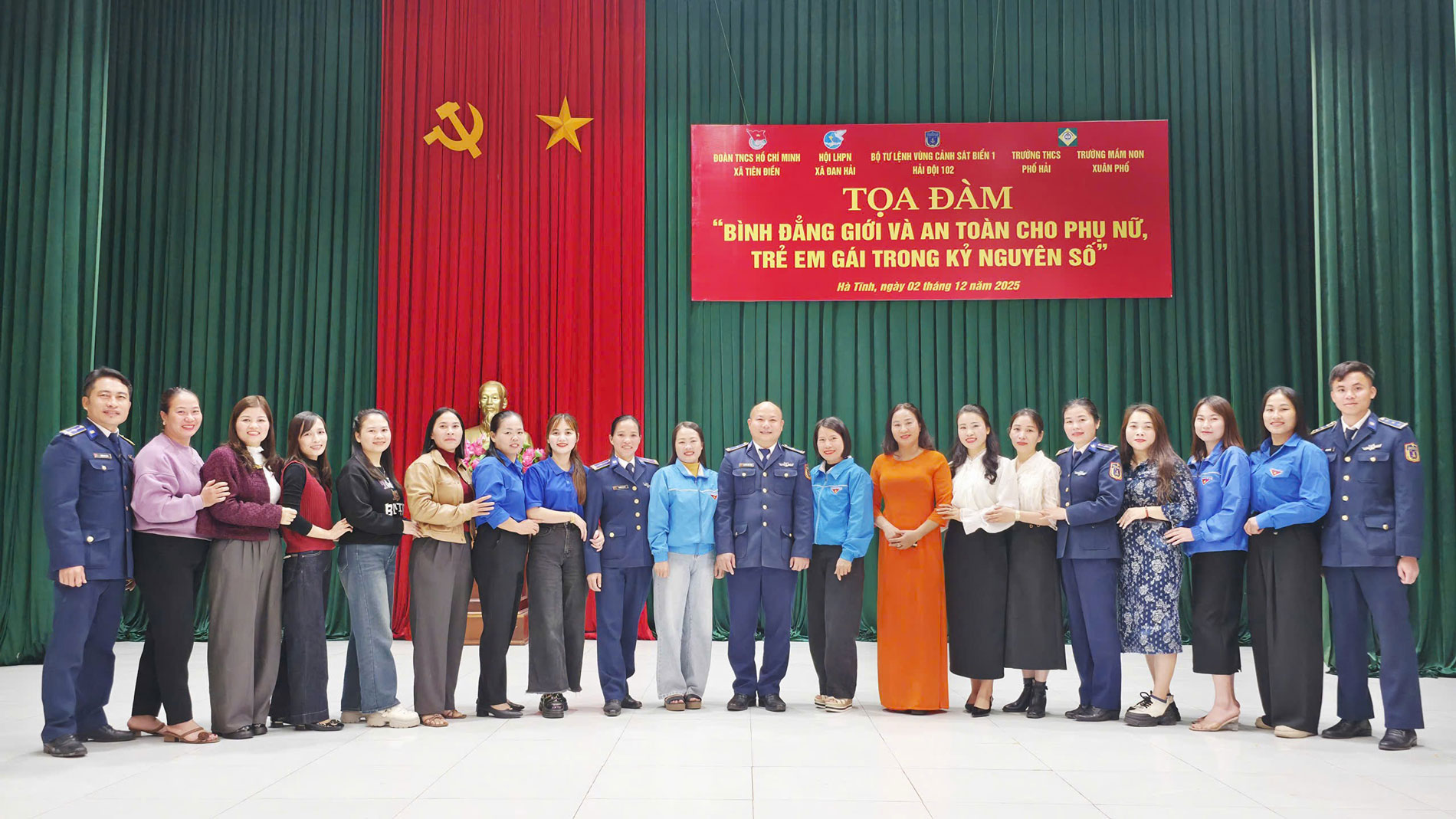 Chiều 2/12, tại Hà Tĩnh, Hải đội 102/Bộ Tư lệnh Vùng Cảnh sát biển 1 phối hợp với Hội Liên hiệp phụ nữ xã Đan Hải, Đoàn Thanh niên xã Tiên Điền, Trường THCS Phổ Hải và Trường Mầm non Xuân Phổ tổ chức tọa đàm với chủ đề “Bình đẳng giới và an toàn cho phụ nữ, trẻ em gái trong kỷ nguyên số”. Đây là hoạt động thiết thực hưởng ứng Tháng hành động vì bình đẳng giới và phòng ngừa, ứng phó với bạo lực trên cơ sở giới năm 2025 trong Bộ Tư lệnh Vùng Cảnh sát biển 1.