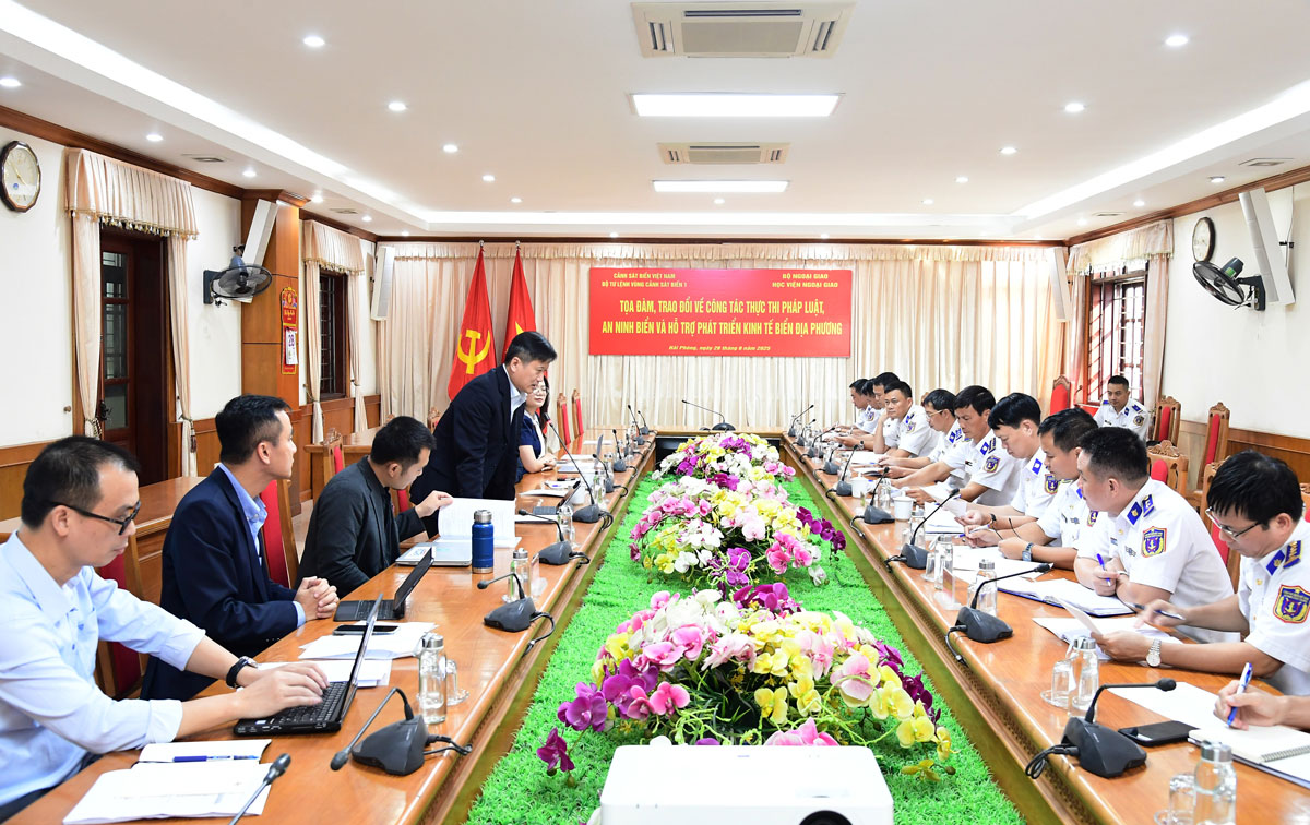 Trong khuôn khổ chuyến khảo sát thực tế tại thành phố Hải Phòng nhằm phục vụ xây dựng Đề tài cấp Nhà nước “Nghiên cứu khoa học và công nghệ phục vụ phát triển bền vững kinh tế biển”, chiều 28/8, Đoàn công tác Học viện Ngoại giao do TS. Nguyễn Hùng Sơn - Giám đốc Học viện làm trưởng đoàn đã có buổi làm việc tại Bộ Tư lệnh Vùng Cảnh sát biển 1. Đại tá Nguyễn Văn Thiện - Phó Tư lệnh Pháp luật Vùng chủ trì làm việc với Đoàn.