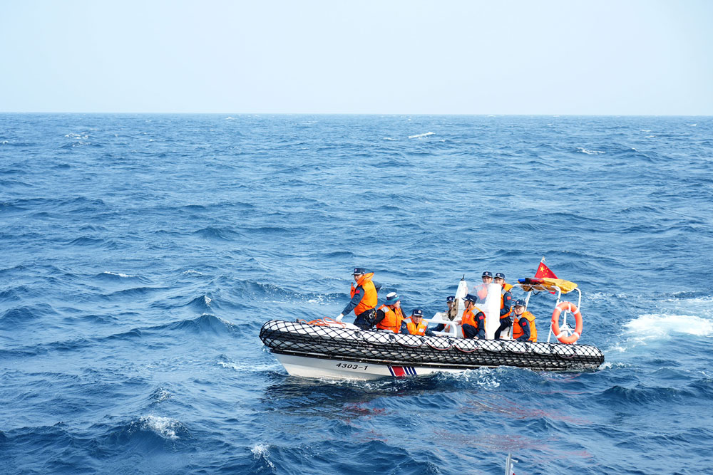 Xuồng của tàu CSB 8004 chở Đoàn công tác Cảnh sát biển Việt Nam sang tàu kỳ hạm 4303 để hội đàm.