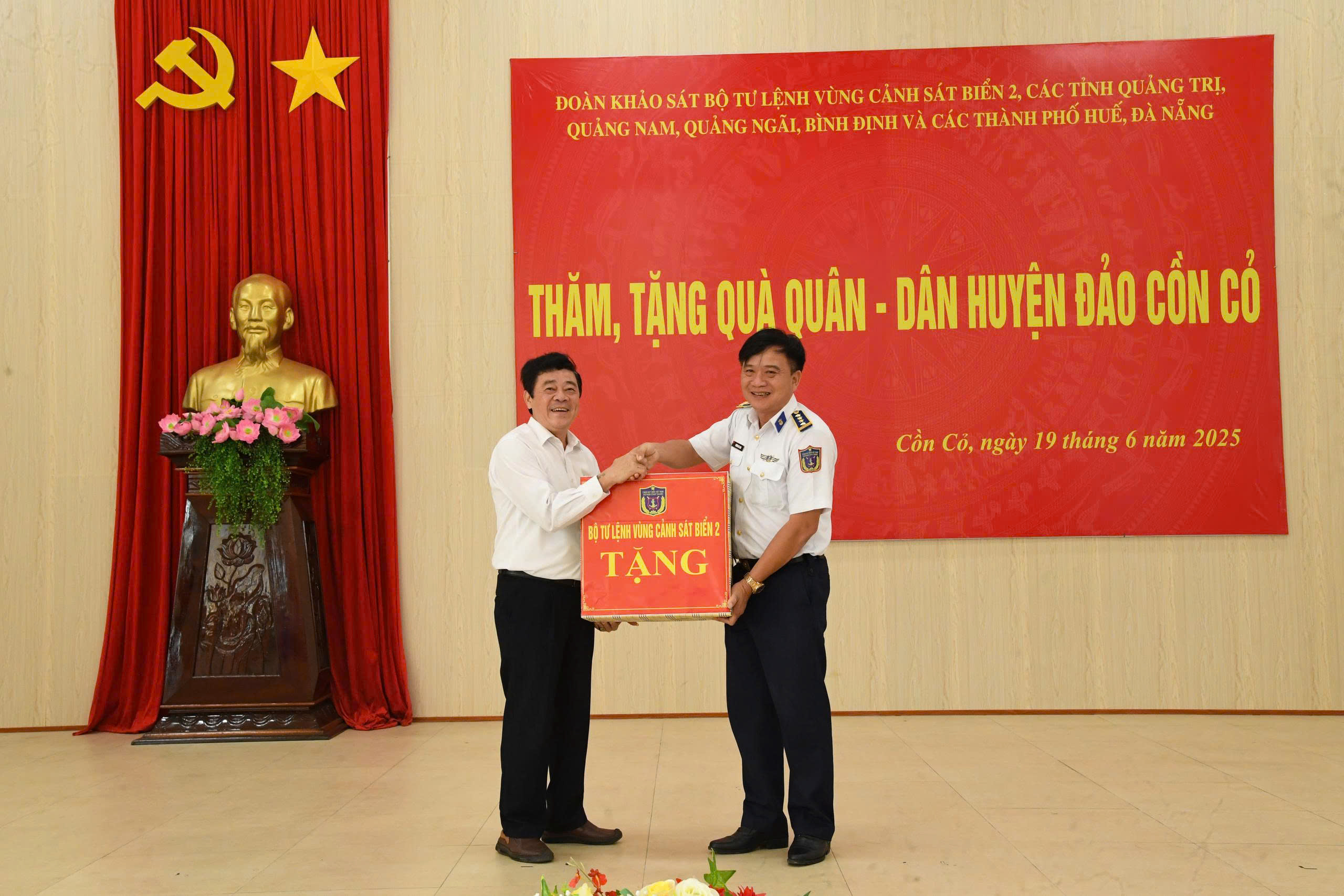 Đại tá Trương Bá Long - Phó Tư lệnh, Tham mưu trưởng Vùng Cảnh sát biển 2 tặng quà chính quyền huyện đảo Cồn Cỏ.