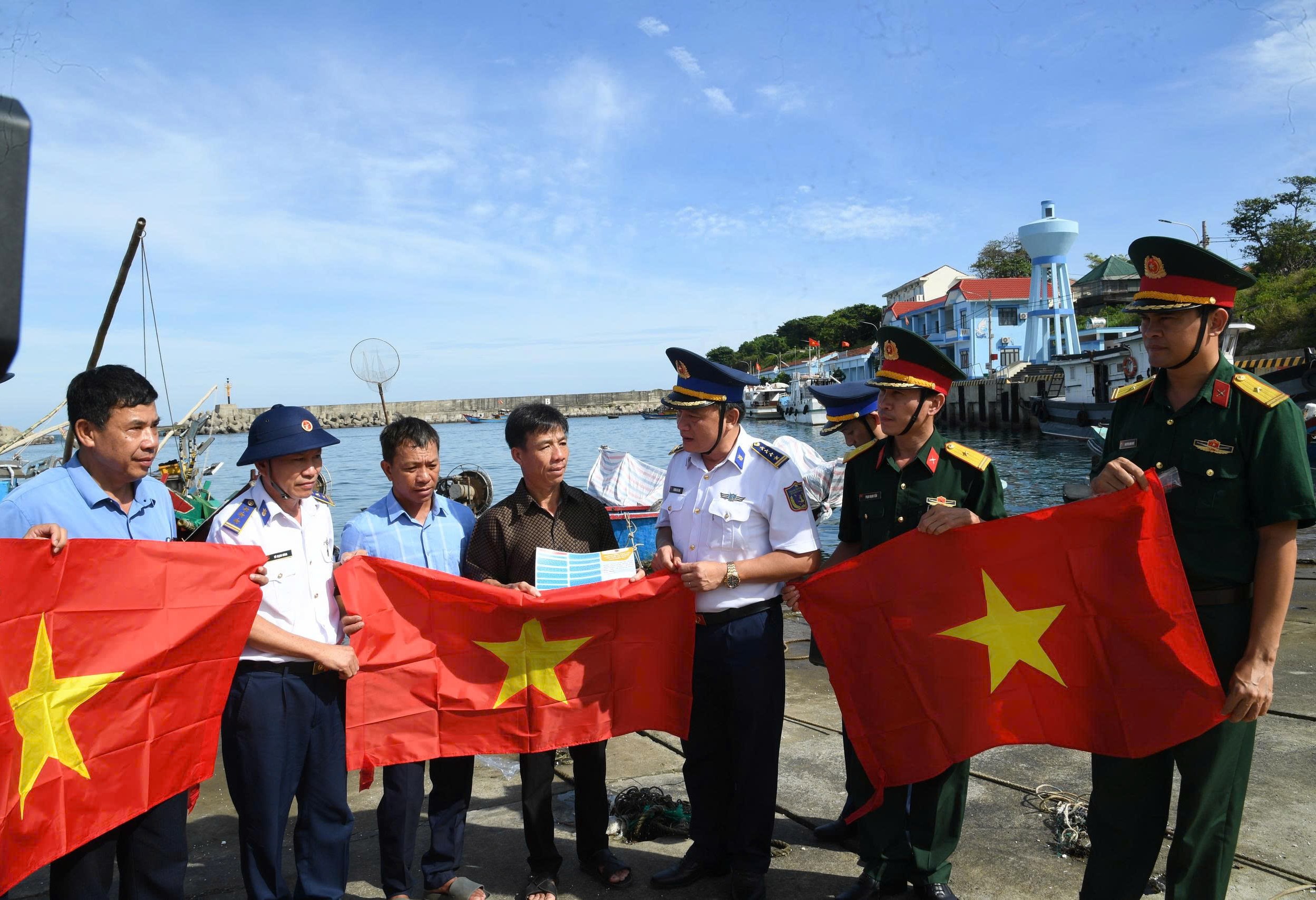 Đoàn công tác đã tiến hành khảo sát khu neo đậu tàu thuyền, kết hợp tuyên truyền, phổ biến pháp luật cho bà con ngư dân, cấp phát tờ rơi, tặng cờ Tổ quốc và trao 2 suất quà tặng chủ các phương tiện tàu thuyền đang neo đậu tại âu tàu.