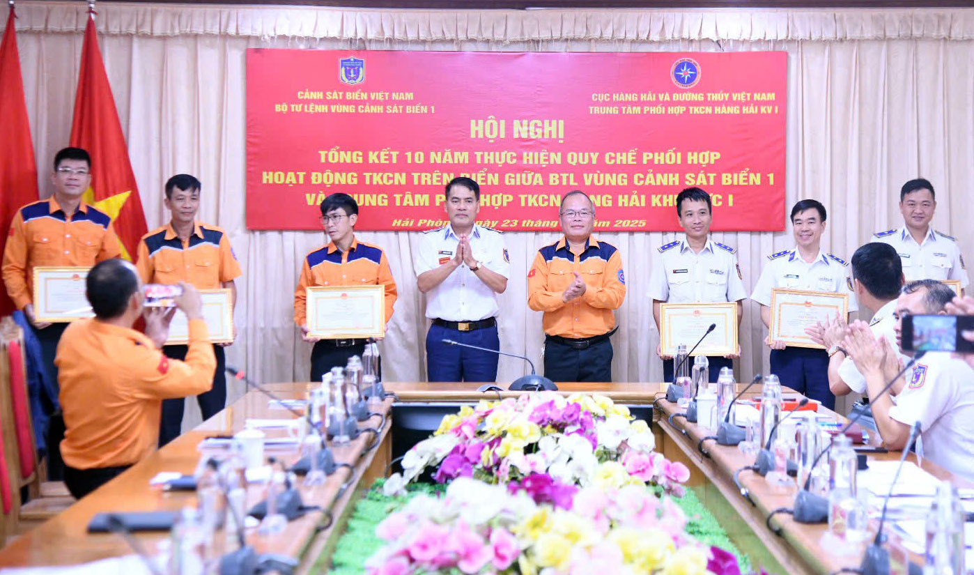 Tại hội nghị, Bộ Tư lệnh Vùng Cảnh sát biển 1 đã khen thưởng 4 tập thể và 2 cá nhân của hai đơn vị đã có thành tích xất sắc trong 10 năm thực hiện quy chế phối hợp hoạt động TKCN trên biển.