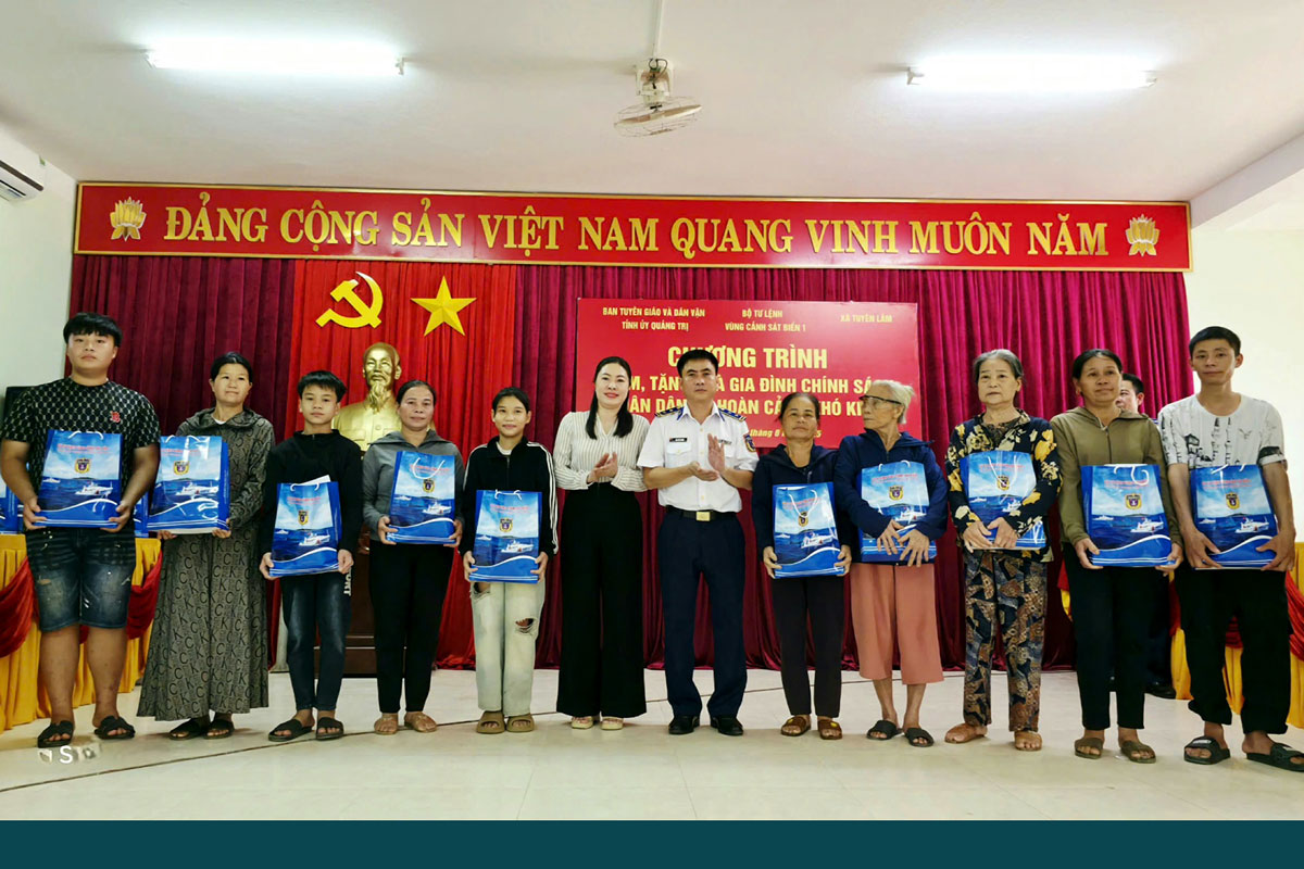 Dịp này, đoàn công tác đã trao tặng 70 suất quà (mỗi suất gồm tiền mặt và hiện vật trị giá 1 triệu đồng) cùng cờ Tổ quốc tặng các gia đình chính sách, hộ nghèo, học sinh có hoàn cảnh khó khăn; đồng thời trực tiếp đến thăm hỏi, động viên và trao quà cho các gia đình liệt sĩ tại thôn Thanh Lạng và bản Kè xã Tuyên Lâm. Tại các gia đình, cán bộ, chiến sĩ Cảnh sát biển ân cần thăm hỏi sức khỏe, lắng nghe tâm tư, nguyện vọng của bà con, bày tỏ sự tri ân sâu sắc đối với những cống hiến, hy sinh của các thế hệ đi trước. Những phần quà tuy không lớn về giá trị vật chất nhưng là sự sẻ chia nghĩa tình, góp phần xoa dịu khó khăn, tiếp thêm nghị lực để các gia đình chính sách, hộ nghèo, học sinh vượt khó vươn lên trong cuộc sống.