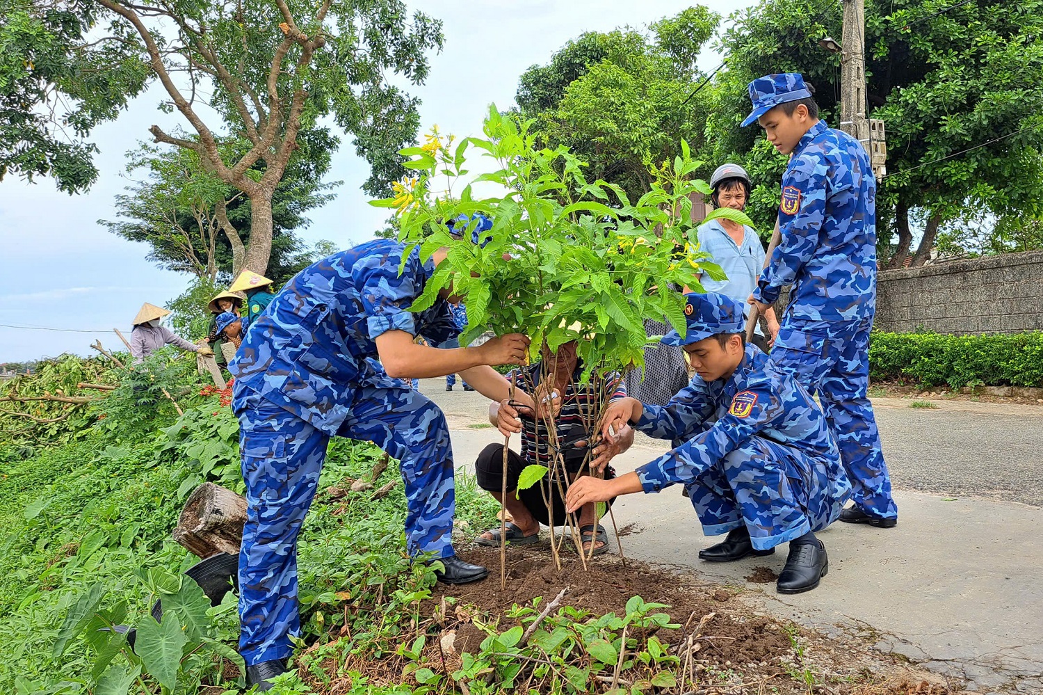 Cán bộ, chiến sĩ Hải đội 102 phối hợp với chính quyền địa phương chỉnh trang cảnh quan đường làng, ngõ xóm.