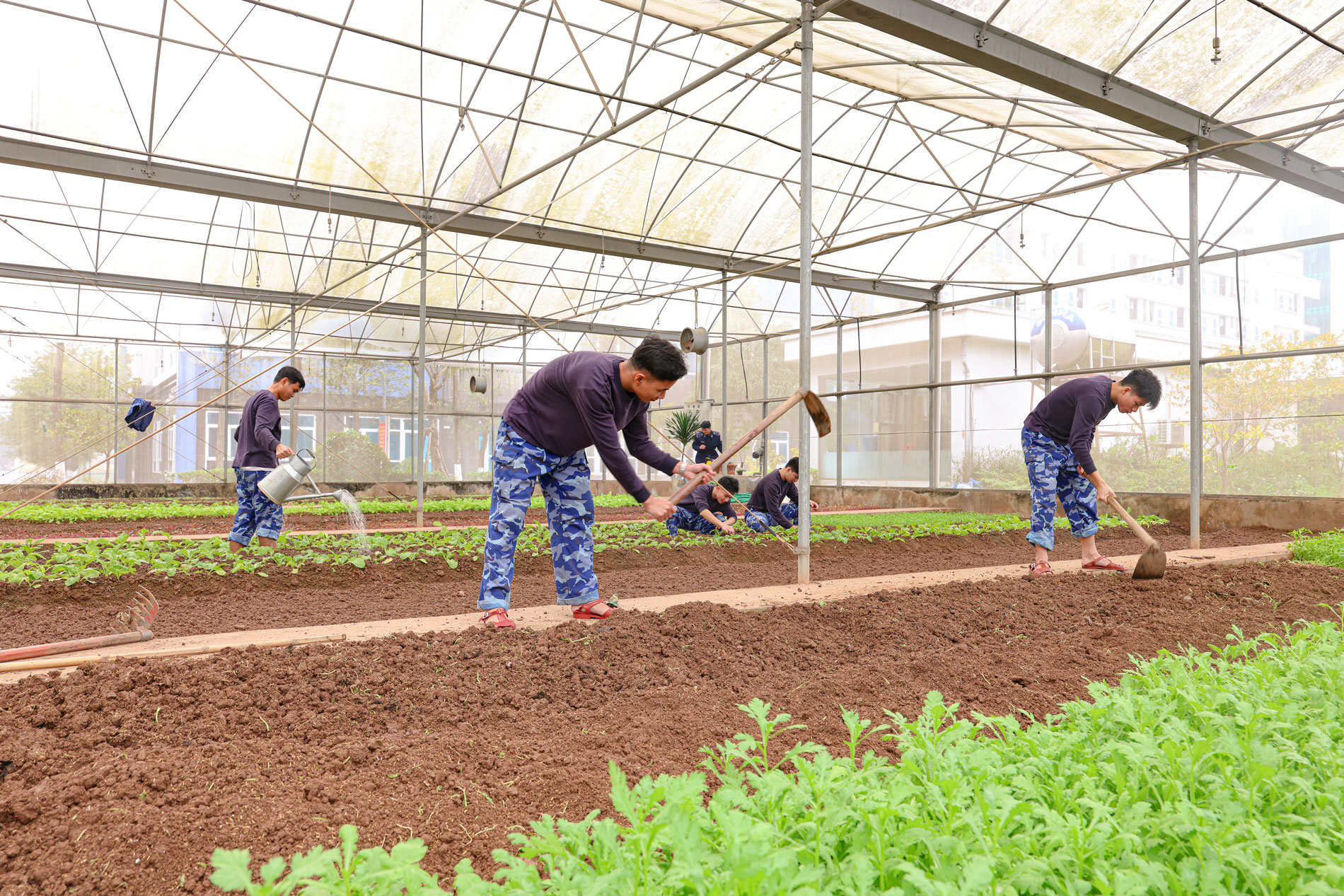 Chiến sĩ chăm sóc vườn rau tăng gia sản xuất.