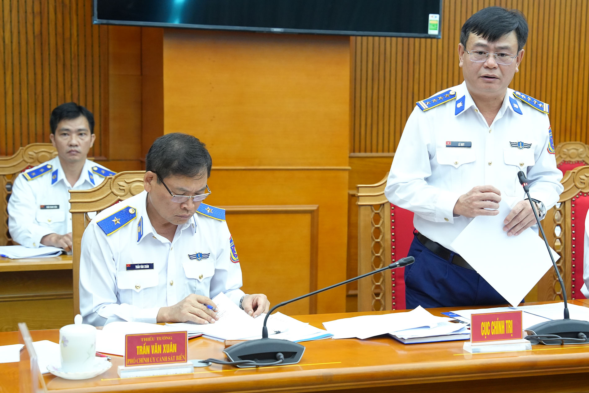 Trung tướng Bùi Quốc Oai - Bí thư Đảng ủy, Chính ủy, Chủ tịch Hội đồng Thi đua - Khen thưởng Cảnh sát biển Việt Nam chủ trì phiên họp.