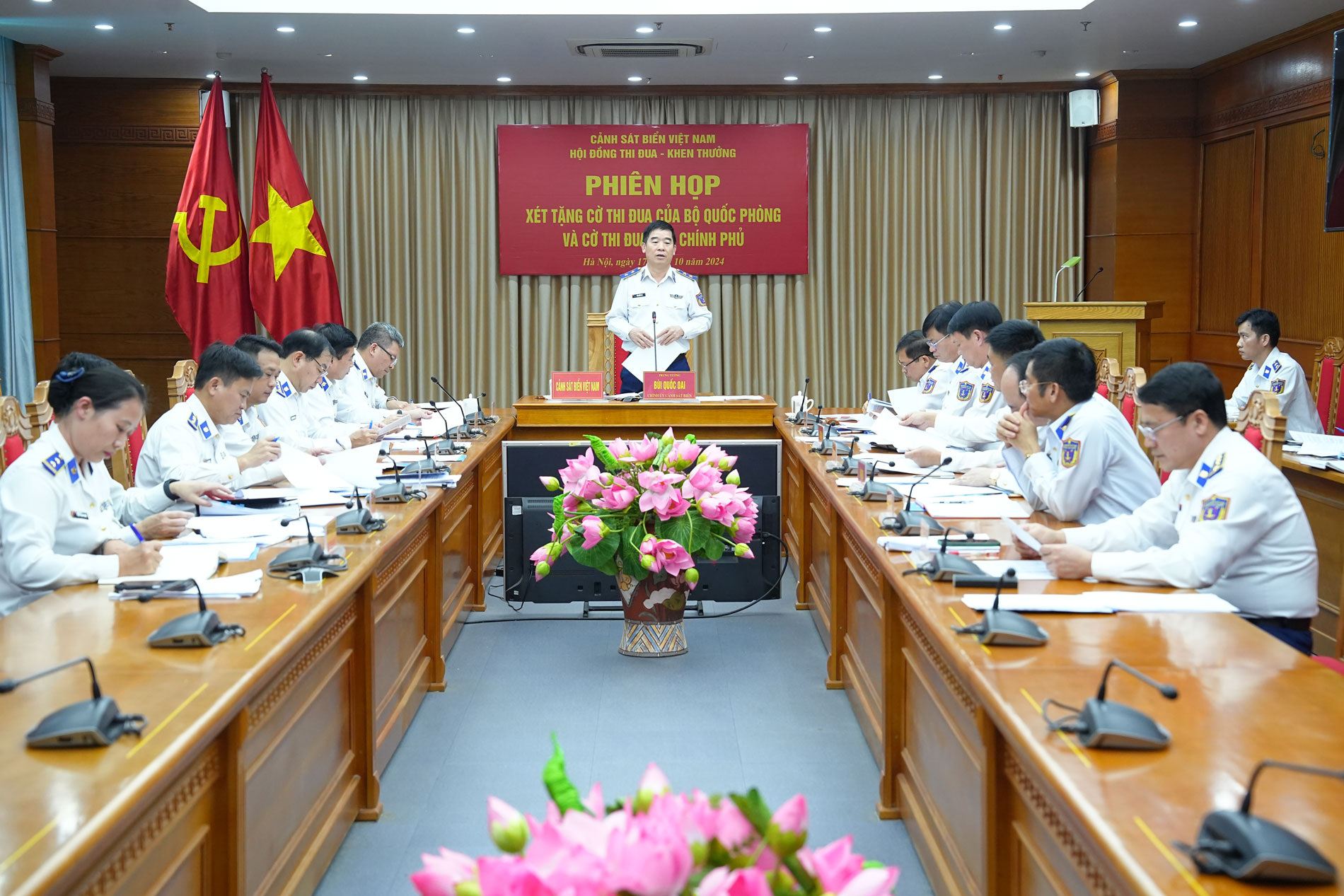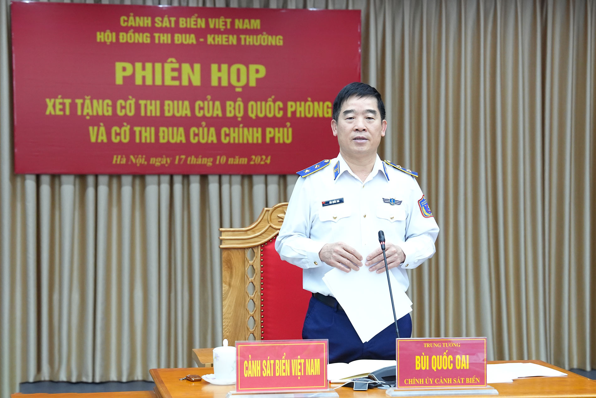 Chiều 17/10, Hội đồng Thi đua - Khen thưởng Cảnh sát biển Việt Nam tổ chức phiên họp cuối năm 2024. Trung tướng Bùi Quốc Oai - Bí thư Đảng ủy, Chính ủy, Chủ tịch Hội đồng Thi đua - Khen thưởng Cảnh sát biển Việt Nam chủ trì phiên họp.