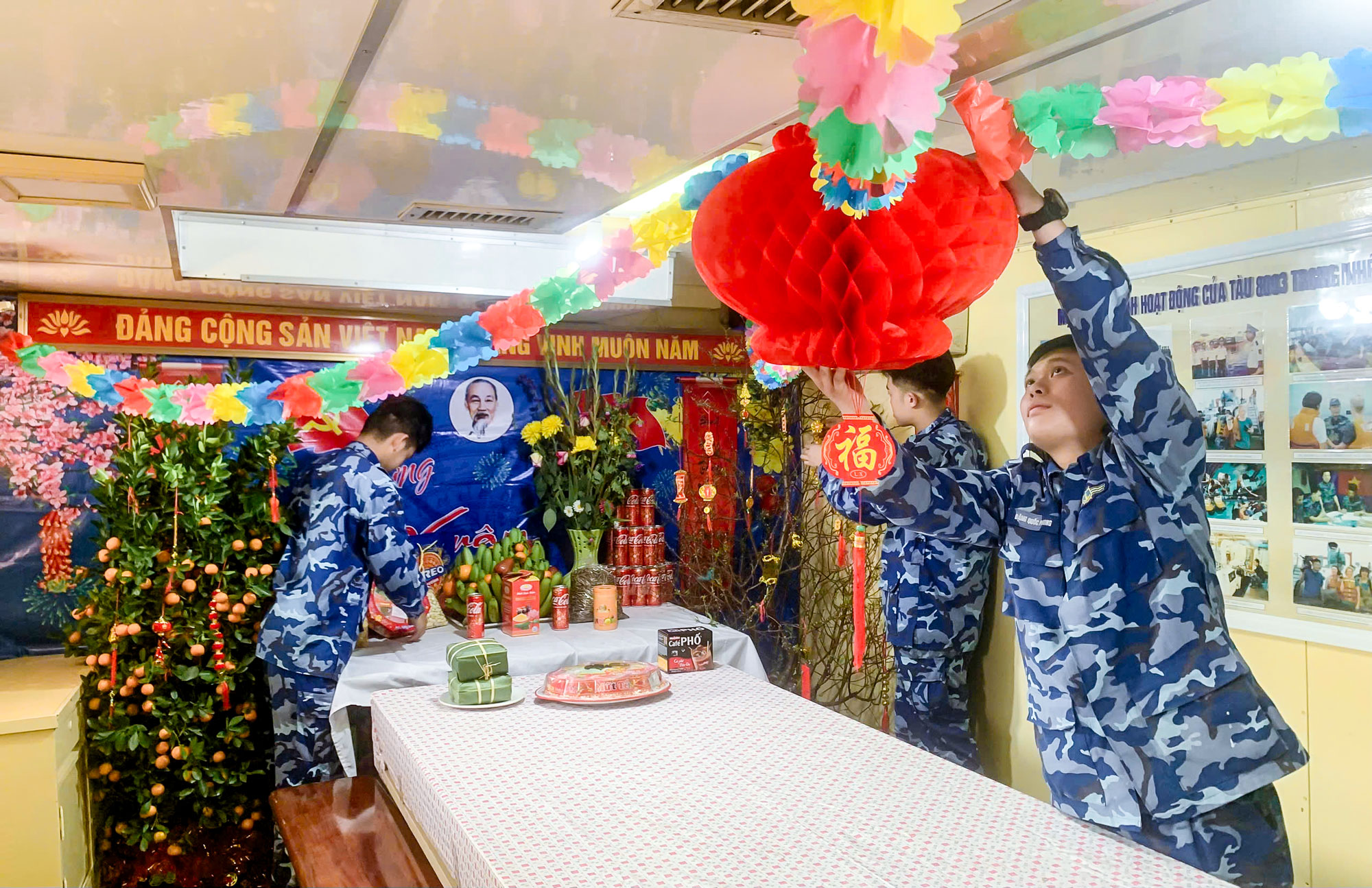 Cán bộ, chiến sĩ Tàu CSB 8003 trang trí phòng đón Xuân trên tàu.