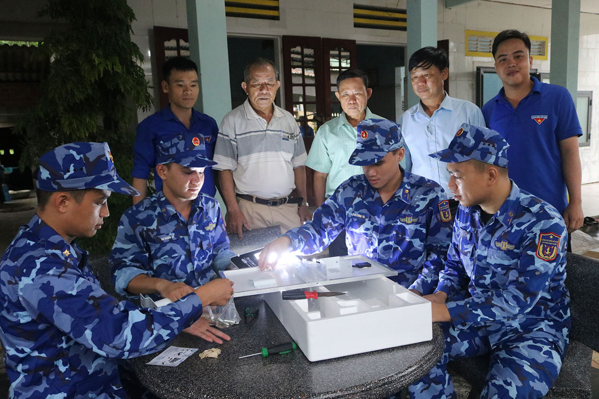 Đoàn viên, thanh niên Bộ Tư lệnh Vùng Cảnh sát biển 2 lắp ráp thiết bị chiếu sáng sử dụng năng lượng mặt trời.