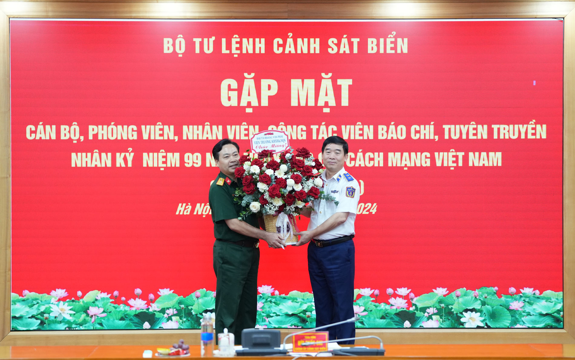 Trung tướng Bùi Quốc Oai - Bí thư Đảng ủy, Chính ủy Cảnh sát biển Việt Nam tặng hoa chúc mừng cán bộ, phóng viên, nhân viên, cộng tác viên báo chí, tuyên truyền.