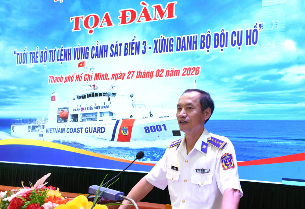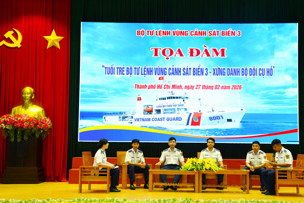 Tối 27/2, tại thành phố Hồ Chí Minh, Bộ tư lệnh Vùng Cảnh sát biển 3 tổ chức buổi tọa đàm với chủ đề “Tuổi trẻ Bộ Tư lệnh Vùng Cảnh sát biển 3 - Xứng danh Bộ đội Cụ Hồ”. Đây là hoạt động trong chuỗi sự kiện chào mừng kỷ niệm 25 năm Ngày truyền thống Bộ Tư lệnh Vùng Cảnh sát biển 3 (07/3/2001 - 07/3/2026). Dự và chỉ đạo buổi tọa đàm có Đại tá Lê Văn Tú - Chính ủy Bộ Tư lệnh Vùng, đại biểu chỉ huy các cơ quan, đơn vị cùng hơn 200 cán bộ, đoàn viên, thanh niên và hội viên phụ nữ.