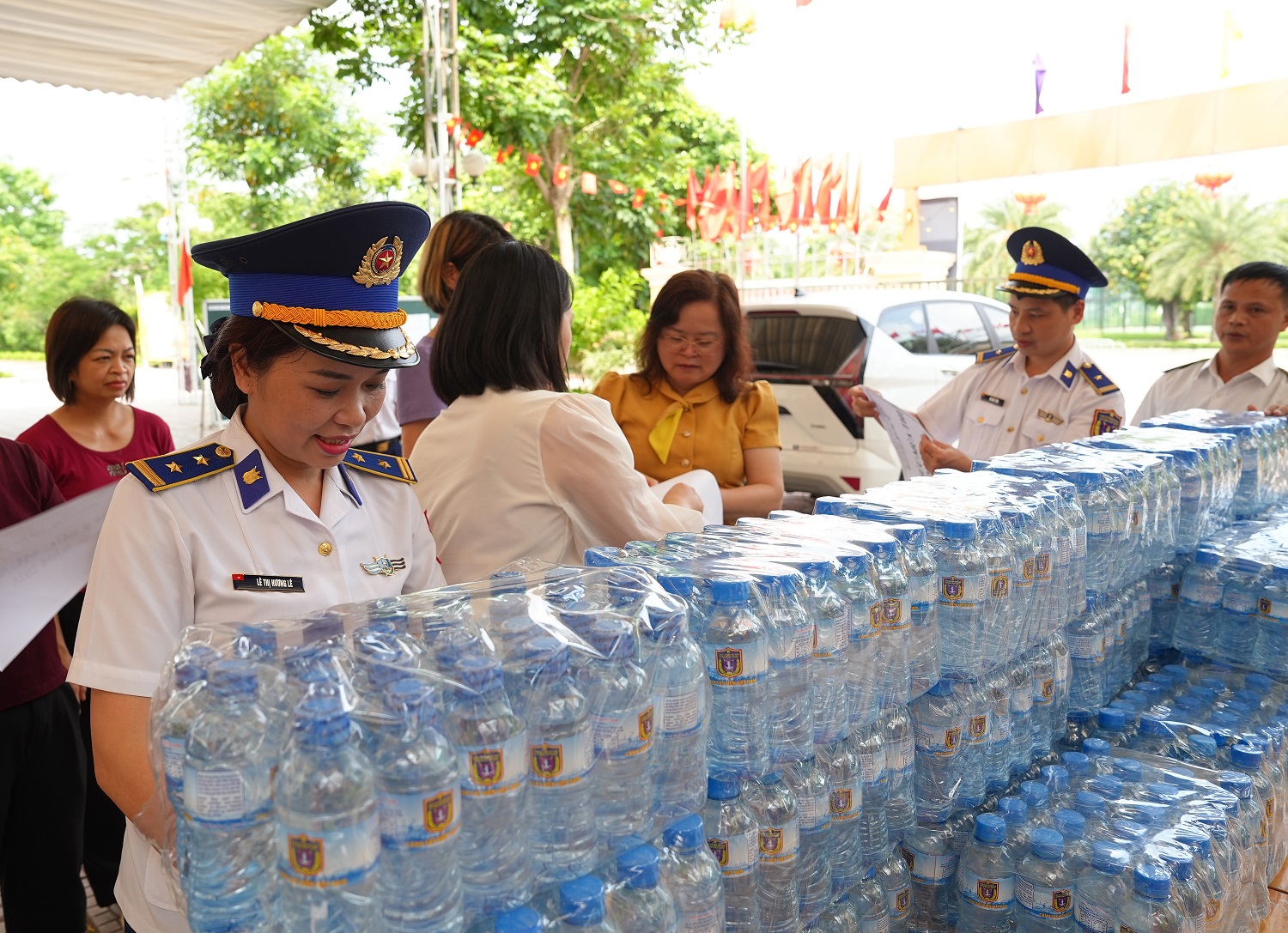Đồng chí Trần Quang Trường đại diện Quận đoàn Nam Từ Liêm tiếp nhận nước từ Đoàn cơ sở và Hội Phụ nữ Bộ Tham mưu Cảnh sát biển.